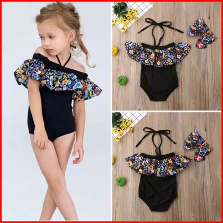 0-5th Baju Renang Anak Bayi Perempuan Set Bandana Black Floral