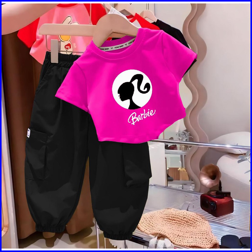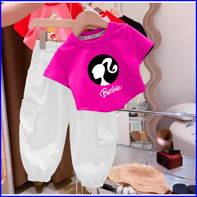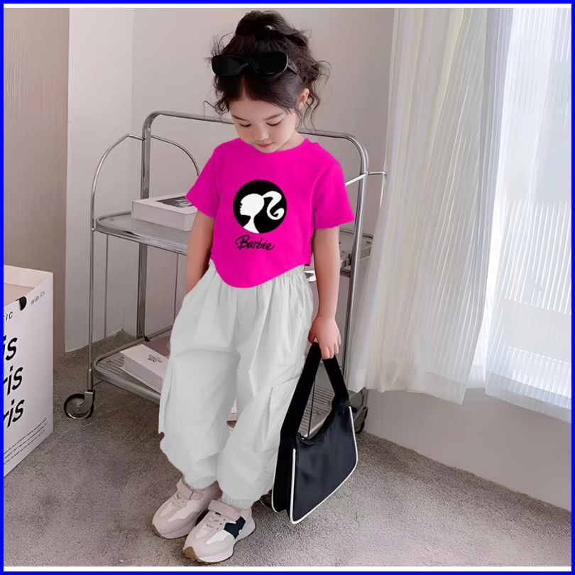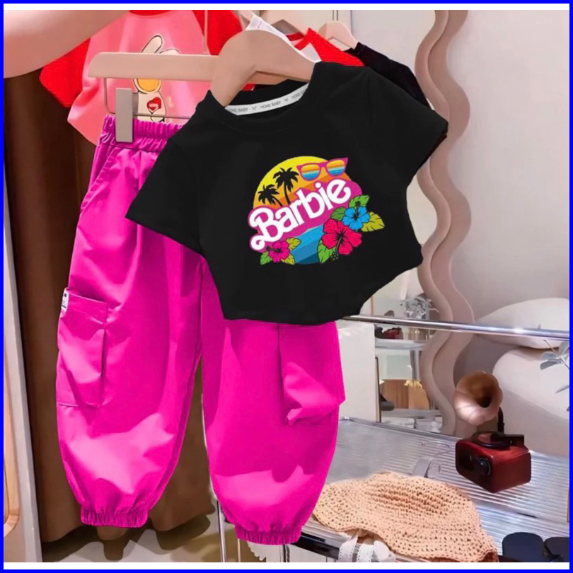 Setelan Anak Kaos Anak Dan Celana Panjang Anak Model Cargo Barbie 1-5 Tahun