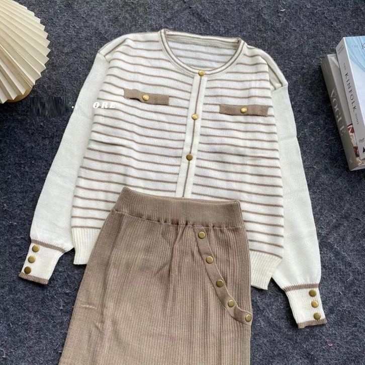 SETELAN KEKINIAN / ANDROK WANITA / ONESET SARWENDAH CARDIGAN STRIPE KOREAN SETELAN ROK PREMIUM