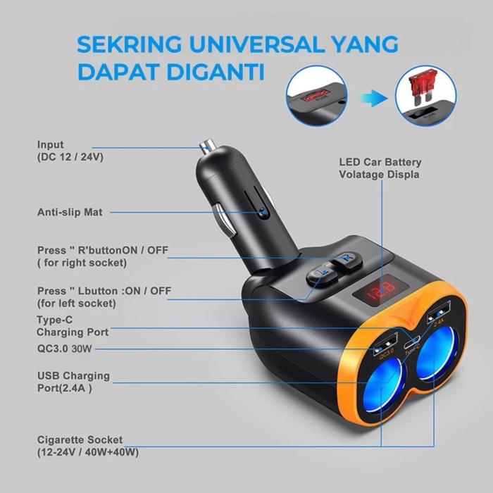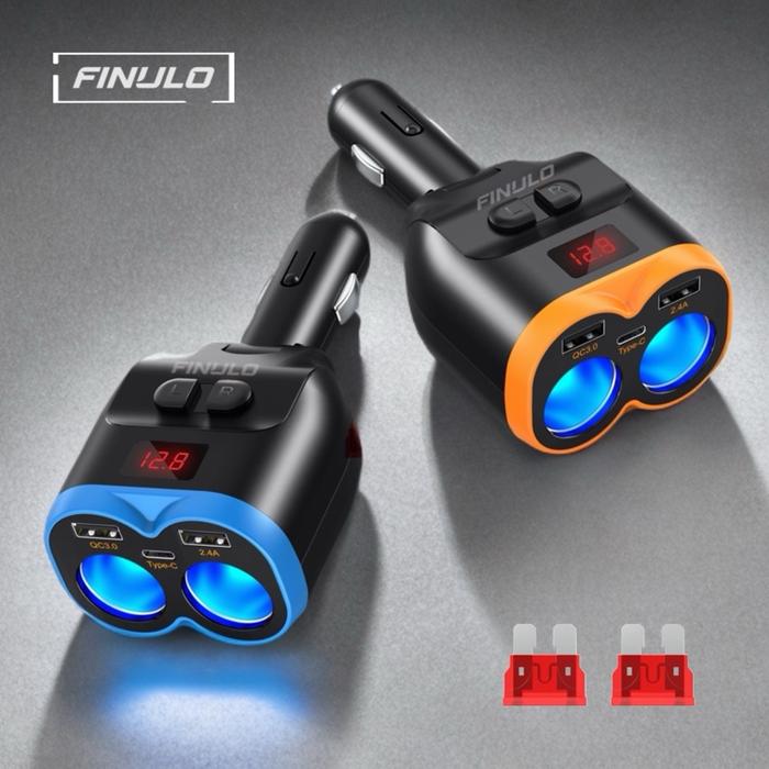 FINULO Charger Handphone Mobil Lighter Socket QC 3.0 Fast Charging Type C PD20W Indikator Voltase Kabel