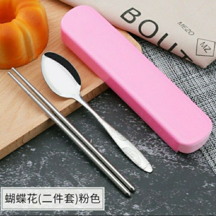 sendok set stainless garpu sumpit korea alat makan travel kit - Biru