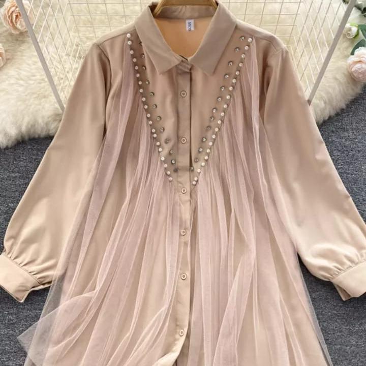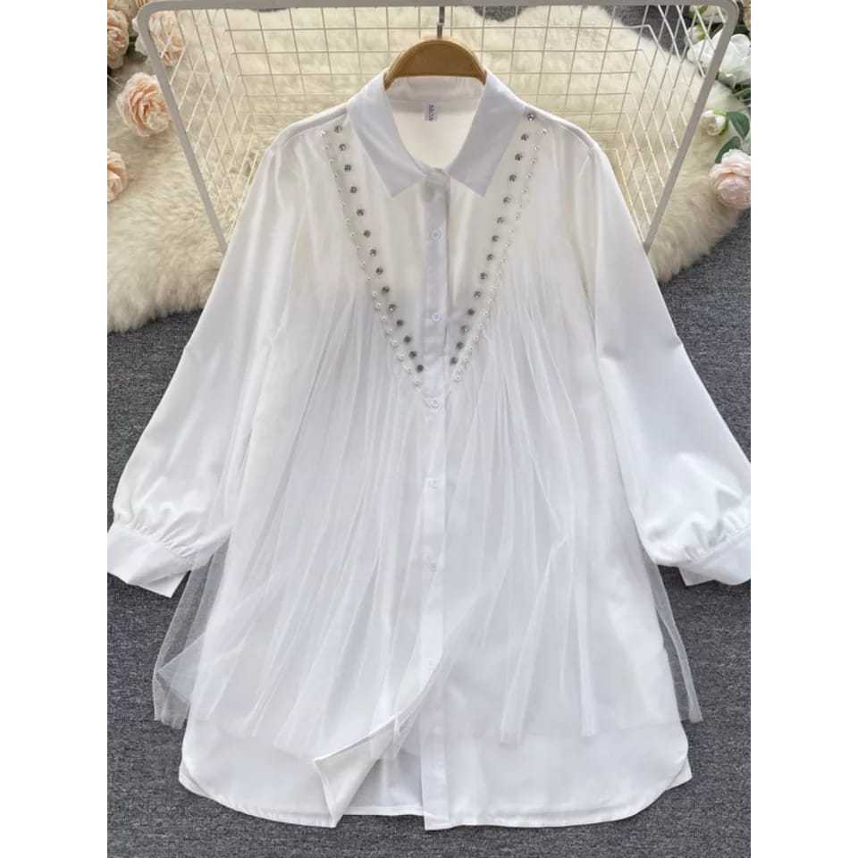 Risa Kemeja wanita mix tile aplikasi mutiara Jumbo tunik BIG SIZE Tunik Over size S M L XL XXL 3XL 5 L Atasan Kancing