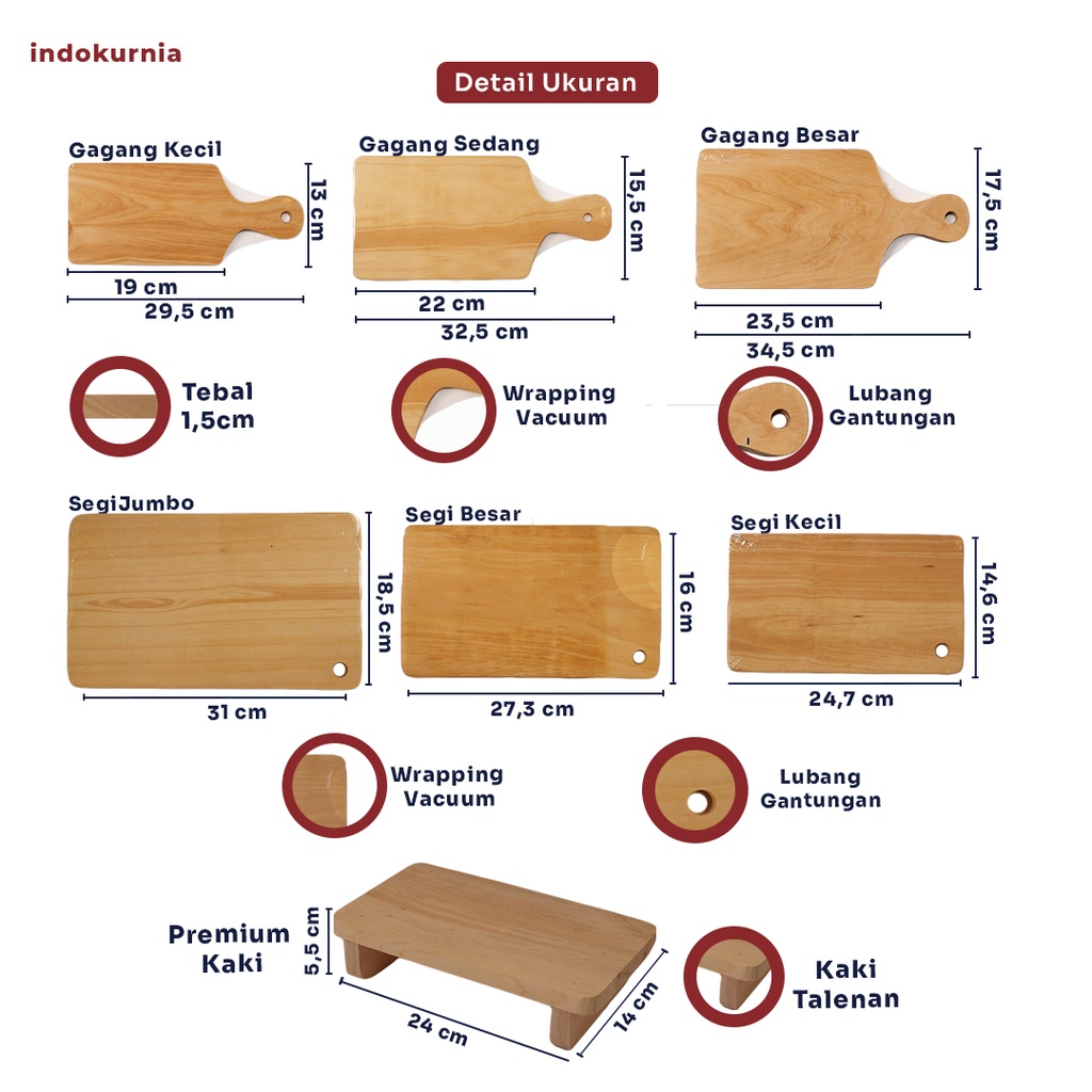 Segi Kecil, Segi Besar, Segi Jumbo, Gagang Kecil, Gagang Sedang, Gagang Besar, Kaki