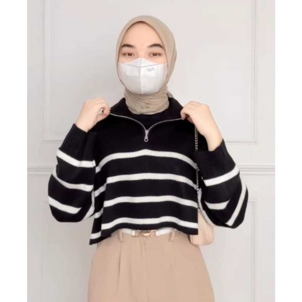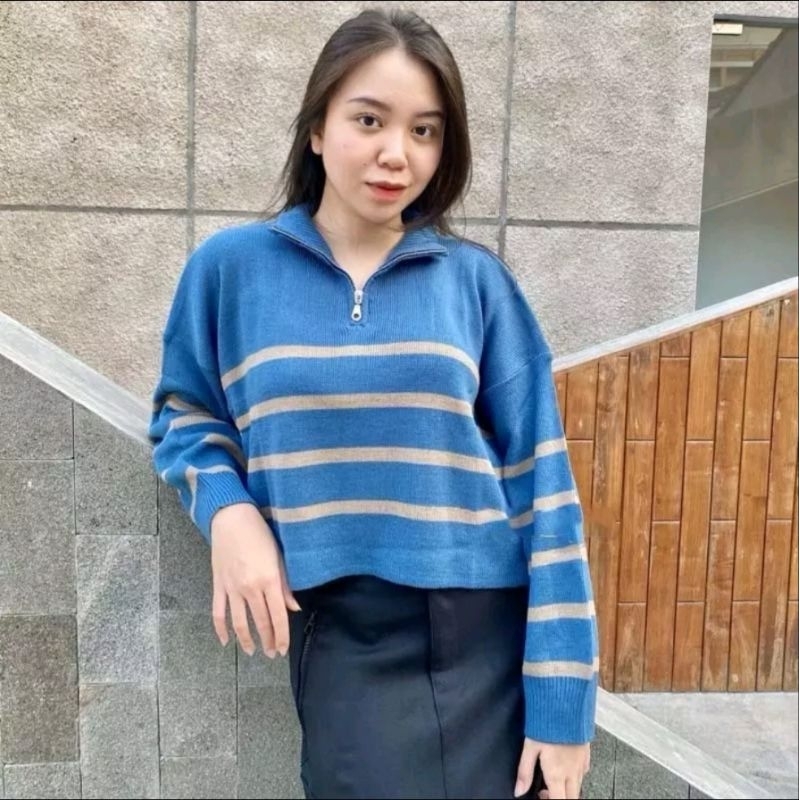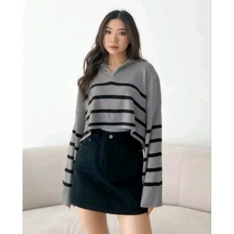 Terlaris Di Sweater Rajut Wanita - Sweater Knit Striped Zipper Crop Premium Size Jumbo BB 40Kg-90Kg