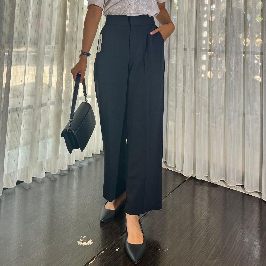 (Gratis Ongkir) ONENAWA Cozie Pants | Highwaist Cullote Pants - Rib Knit Pants - Hitam & Cream - Celana Anti Kusut