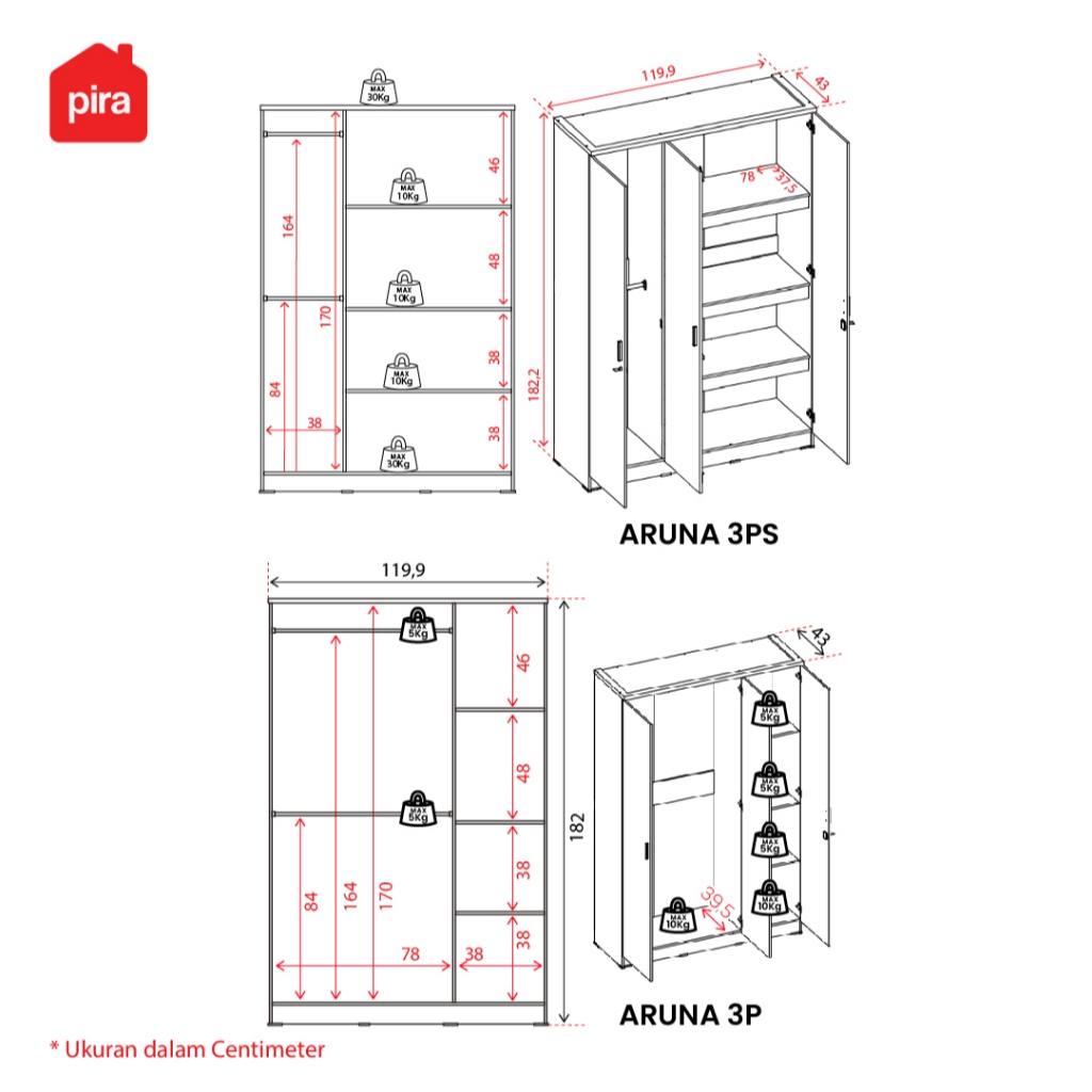 Lemari Pakaian Medium 3 Pintu Full Rak Pira Metropolis - Aruna 3PS TERMURAH GRATIS ONGKIR
