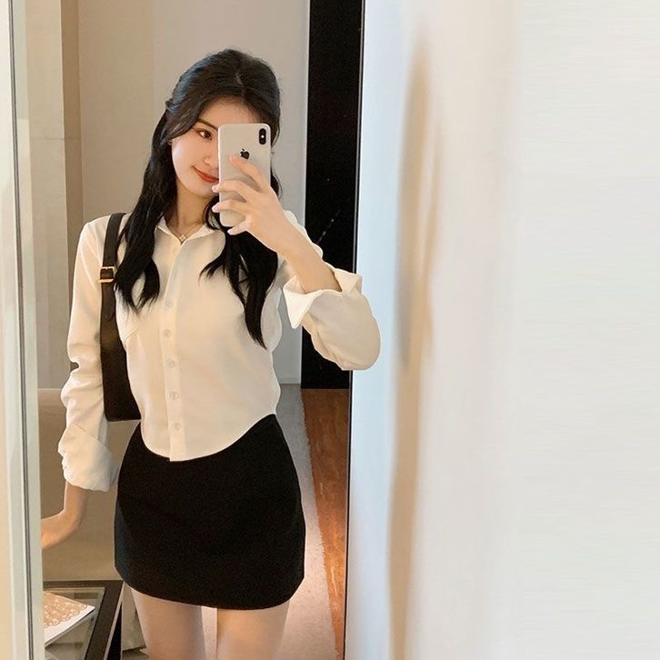 Kemeja Wanita Lengan Panjang Gaya Korea Kemeja Kasual Warna Polos Kemeja Wanita Lengan Panjang Biru