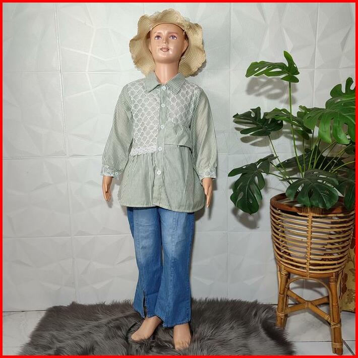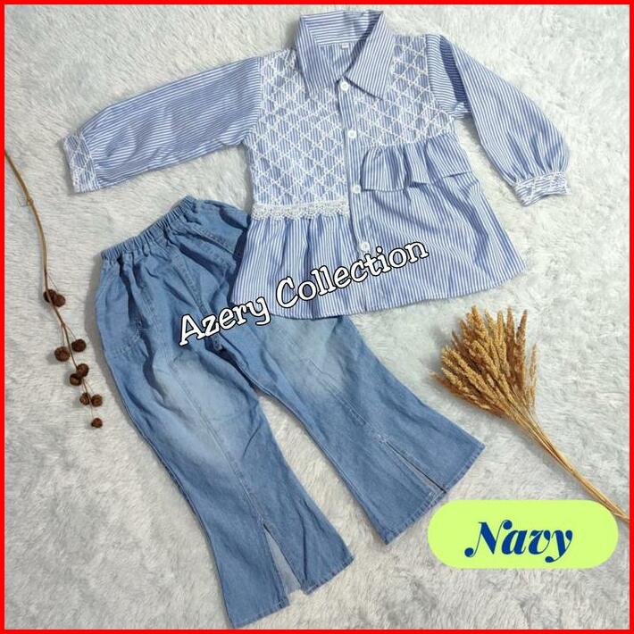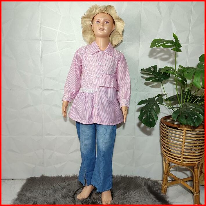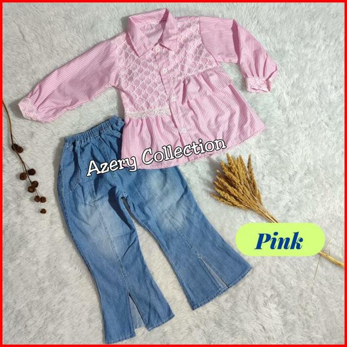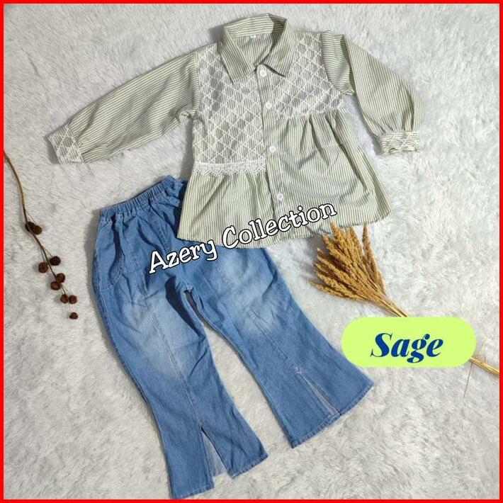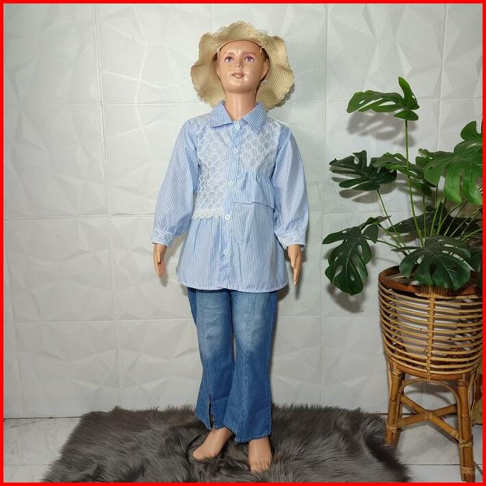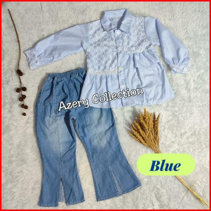 Setelan Anak Perempuan 4-12 Tahun Baju Kemeja Salur Dan Celana Jeans Cutbray
