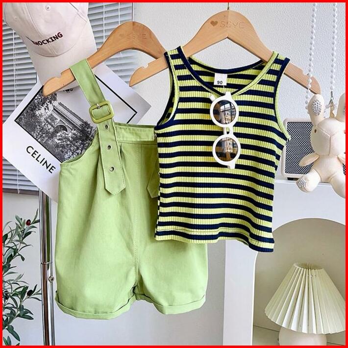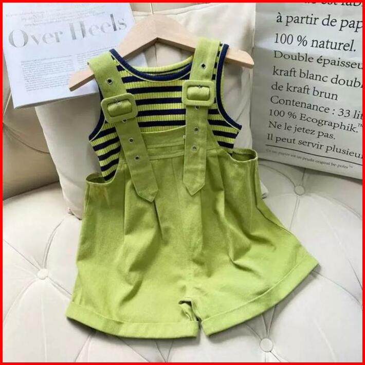 1-8tahun Setelan Overall Tanktop Knit Baju Anak Perempuan Set Hijau 2in1 Anak Cewek Import