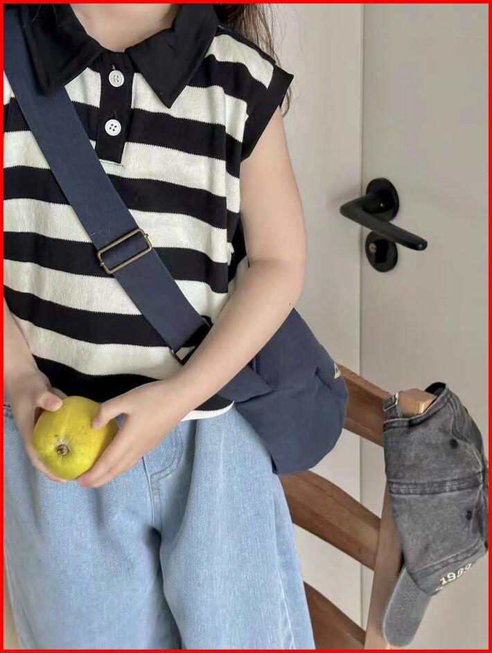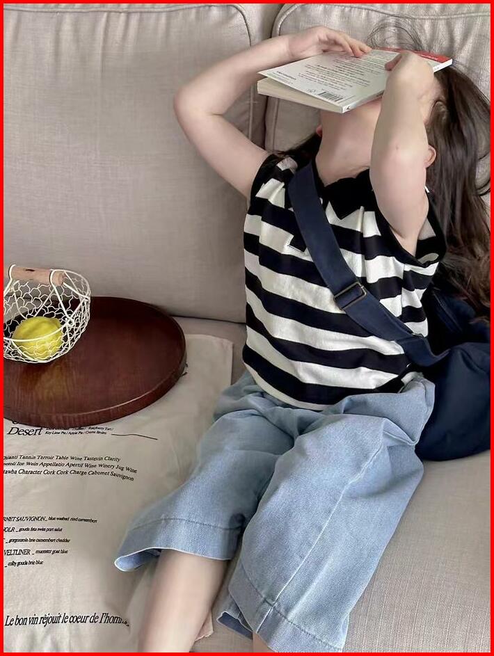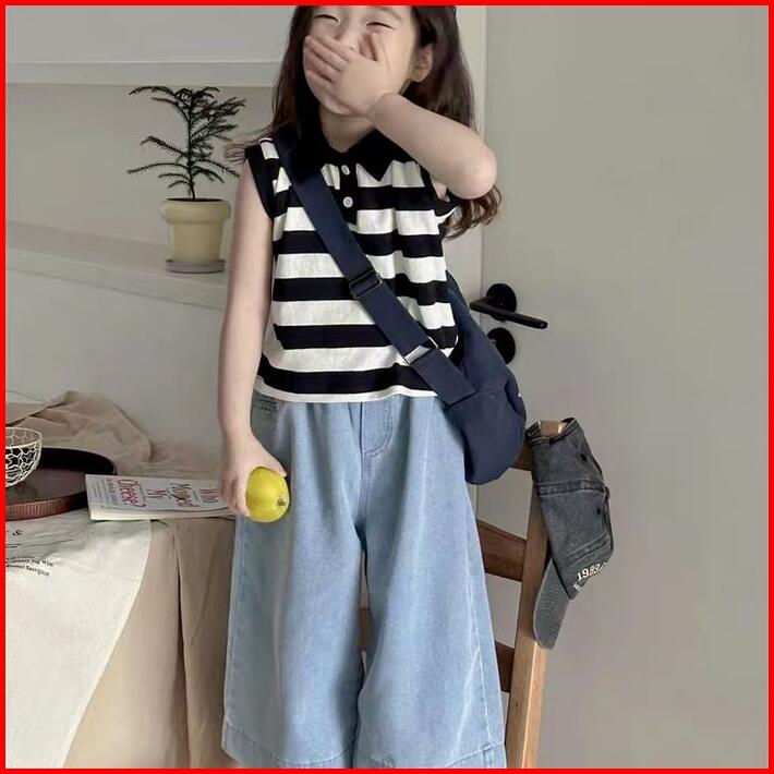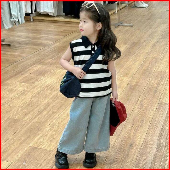Korean Style Setelan Anak Perempuan Polo Striped T-shirt Tanpa Lengan Celana Jeans Panjang Baju Anak Style Terbaru Setel