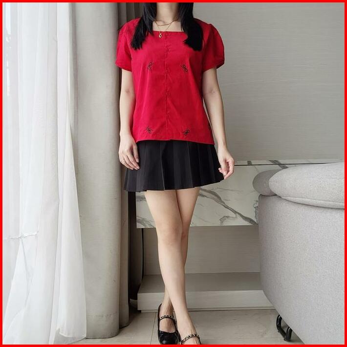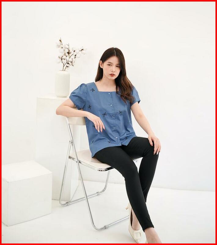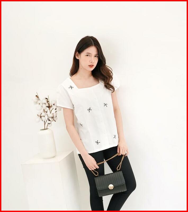 Miki Grace Ribbon Basic Button Cotton Blouse Atasan Blouse Wanita Pita Lengan Pendek Kancing Motif Polos Korean Style Ke