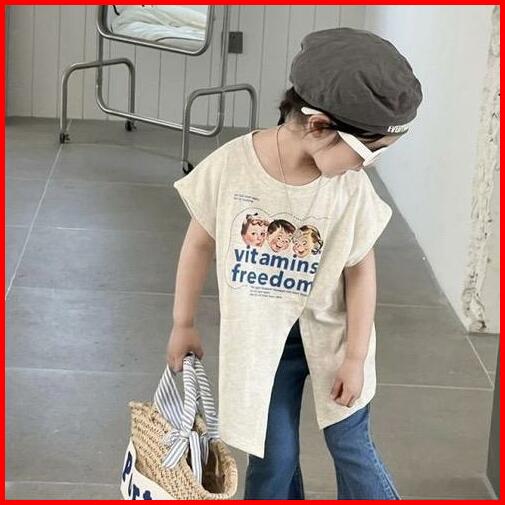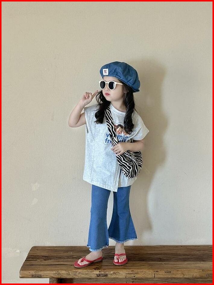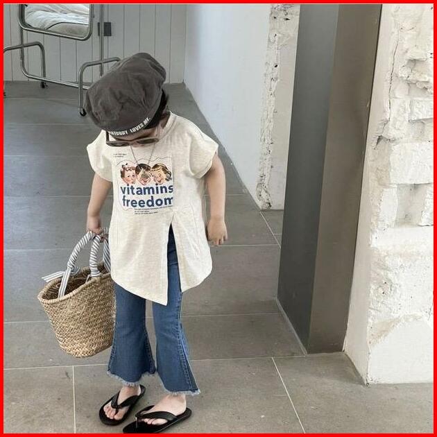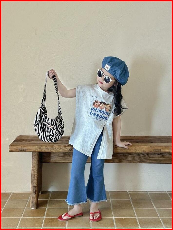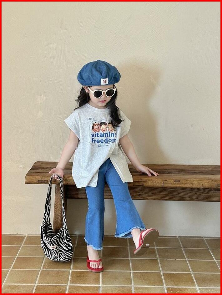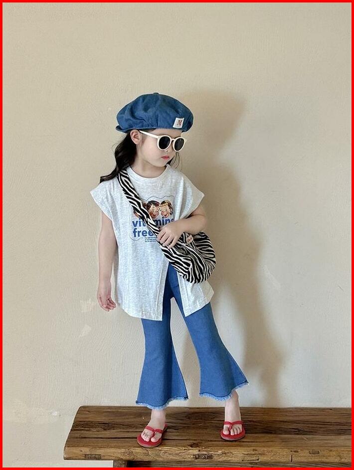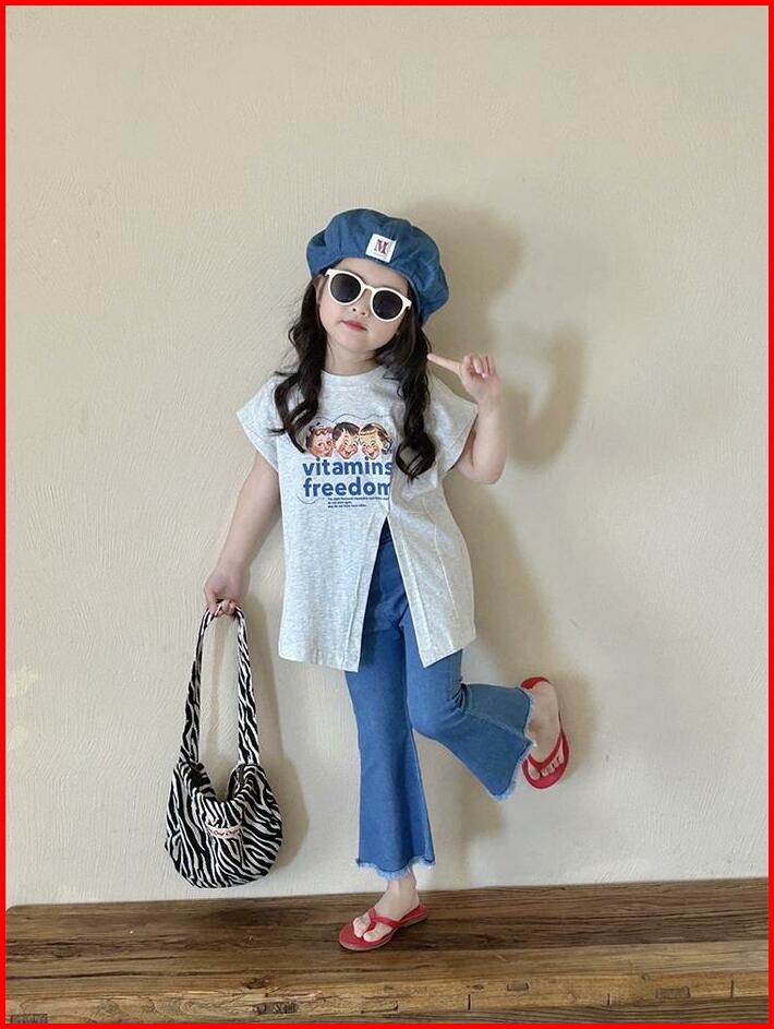 Korean Style Set Anak Cewek Setelan Anak Perempuan T-shirt Belah Samping Celana Jeans Anak Style Baru Anak Perempuan Fas