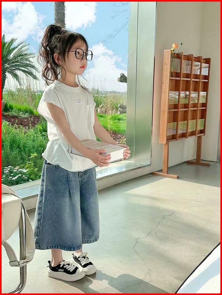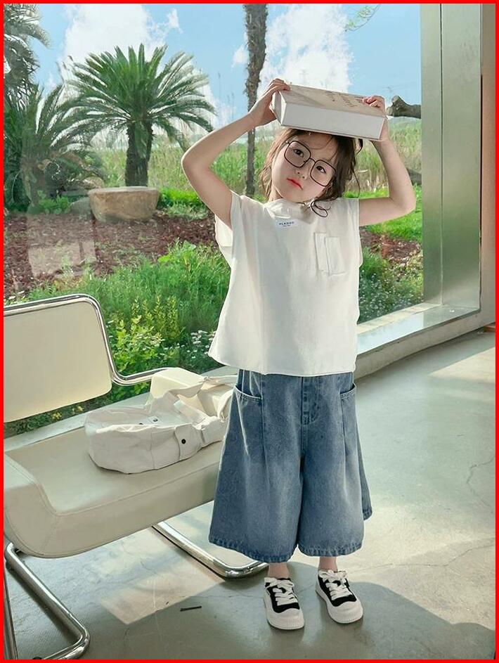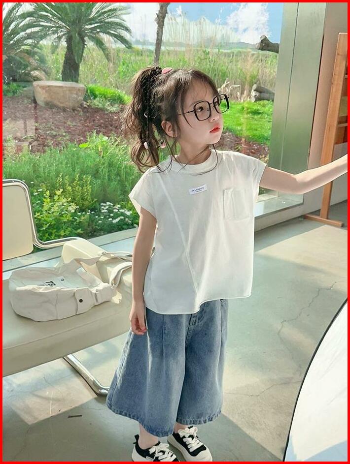 Korean Style Setelan Anak Perempuan Atasan Putih Lengan Pendek Celana Jeans Panjang Baju Anak Perempuan Fashion