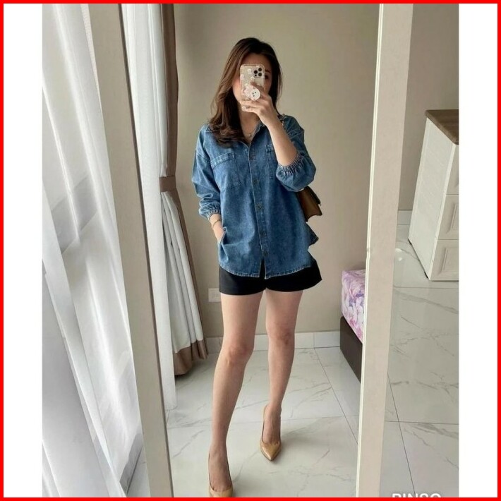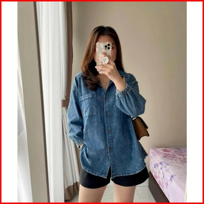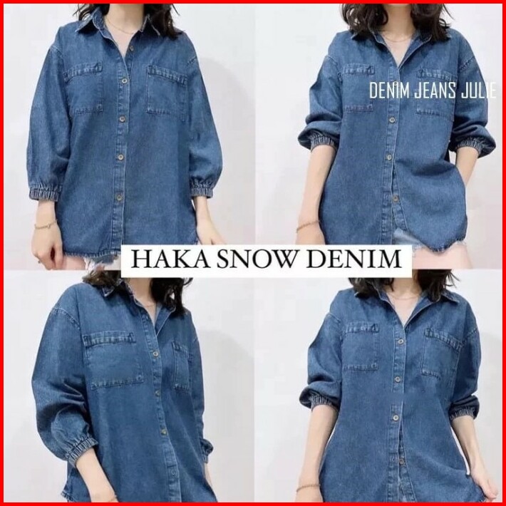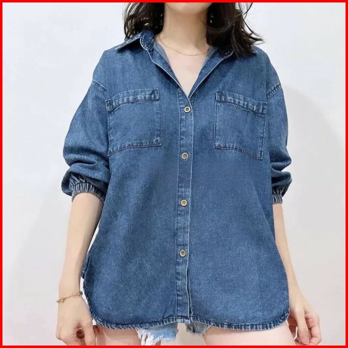Jumbo Kemeja Soft Jeans Wanita Julie Tangan Karet Size L-xxl Ld 110