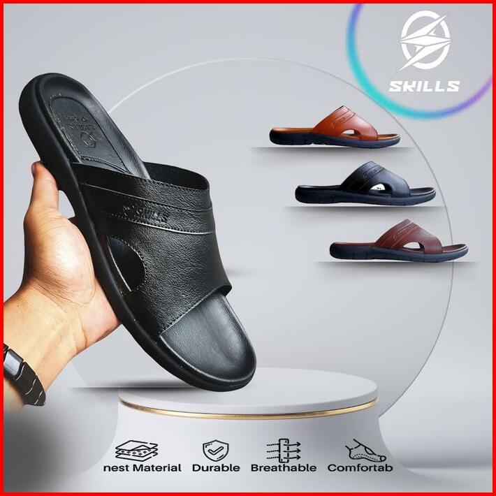 Sandal Pria Merks Skills Rigel Cowok Dewasa Slop Kulit Hitam Slide Slop Distro Casual Original Sendal Kasual