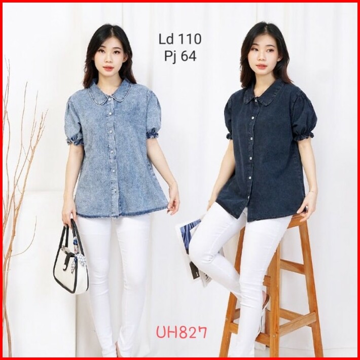 Uh827 Kemeja Wanita Jeans Denim Full Kancing Ld110 Pj64 Lengan Puff Karet Leher Besar