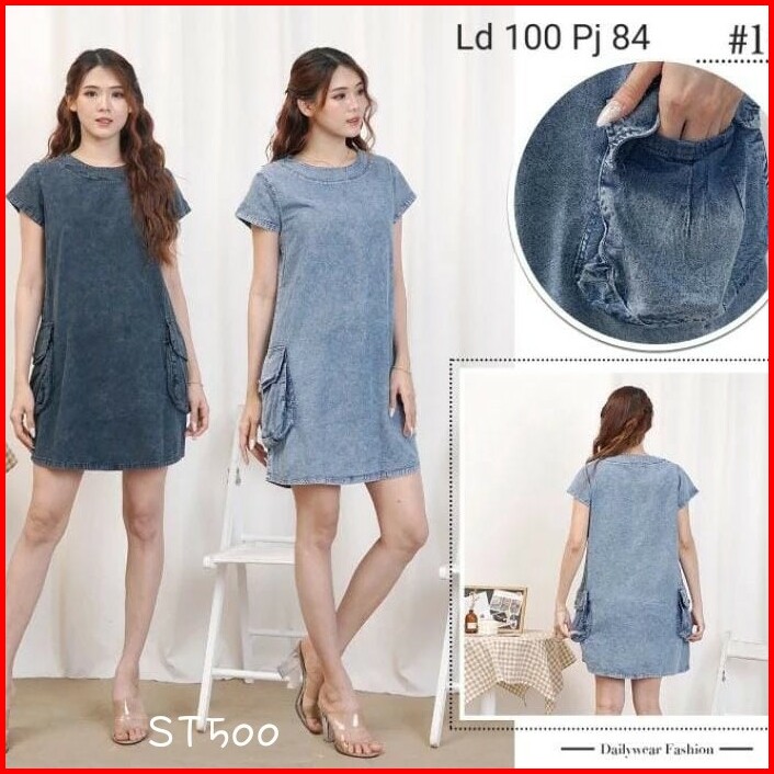 St500 Dress Wanita Jeans Denim Ld100 Pj84 Polos Saku Samping Mini
