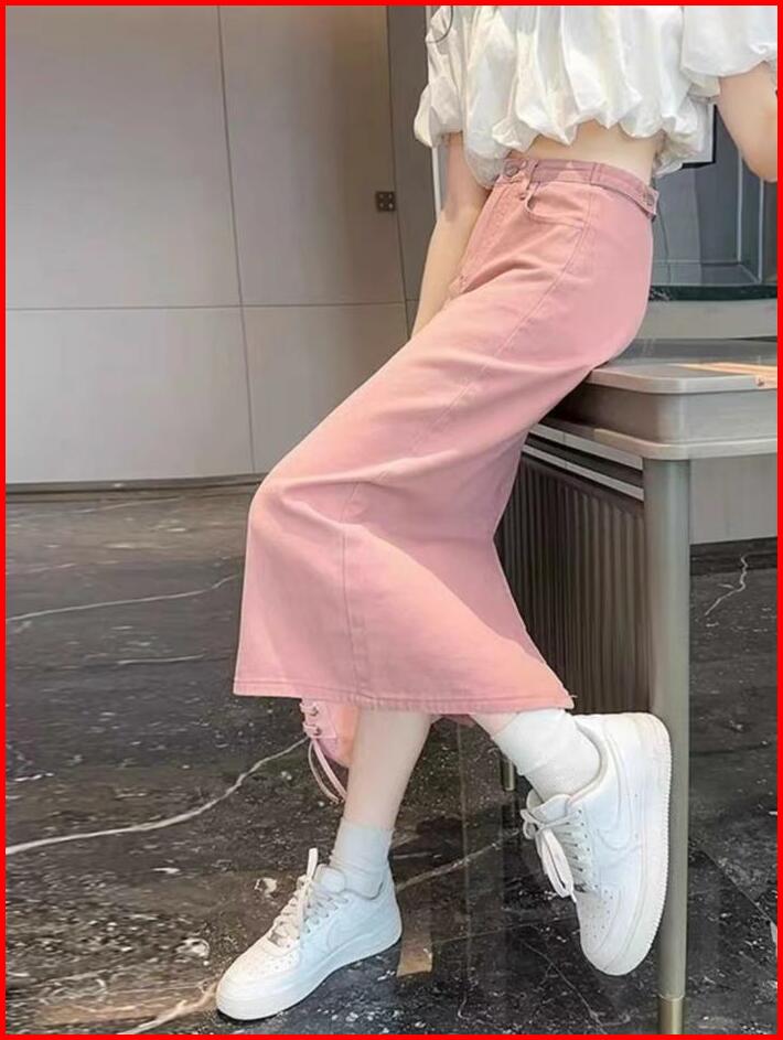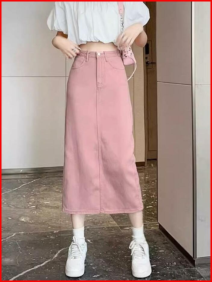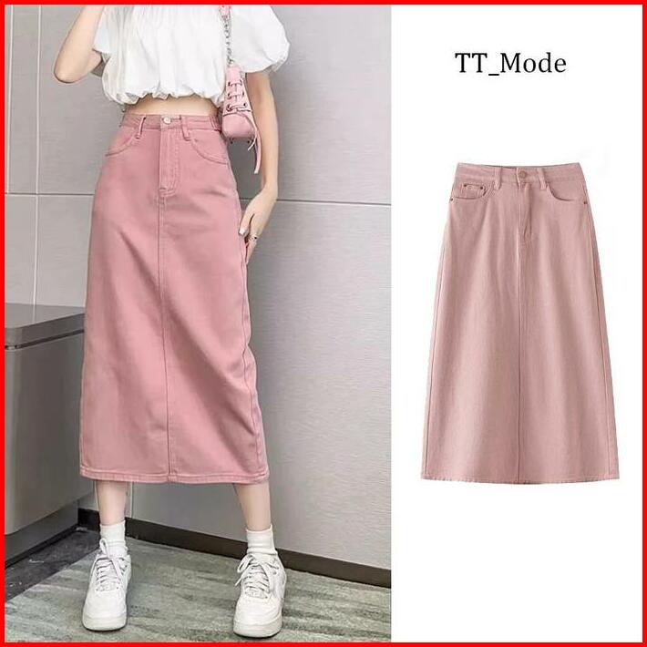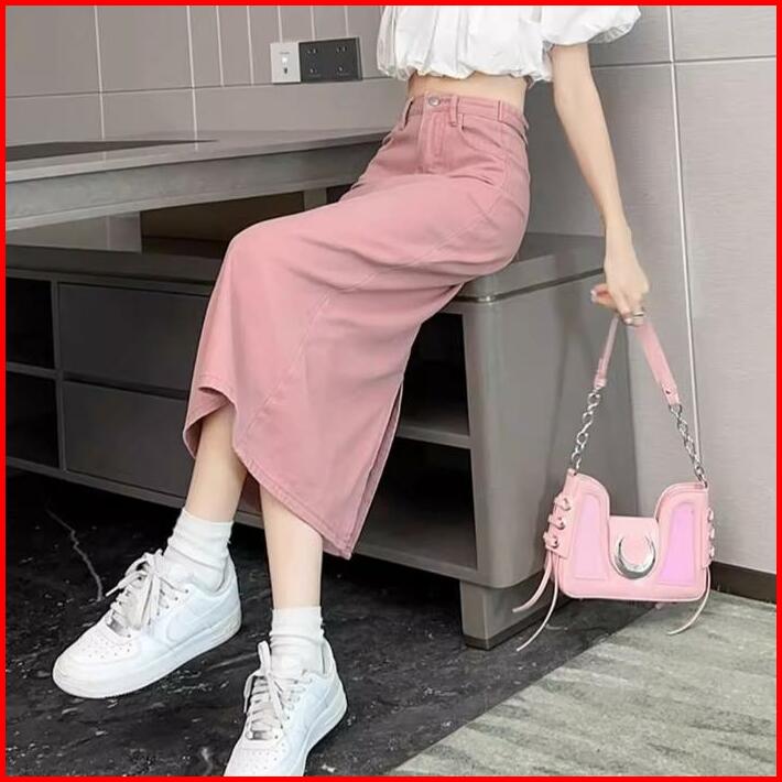 Jeans Rok Wanita Pink Highwaist Rok Midi A-line Denim Split