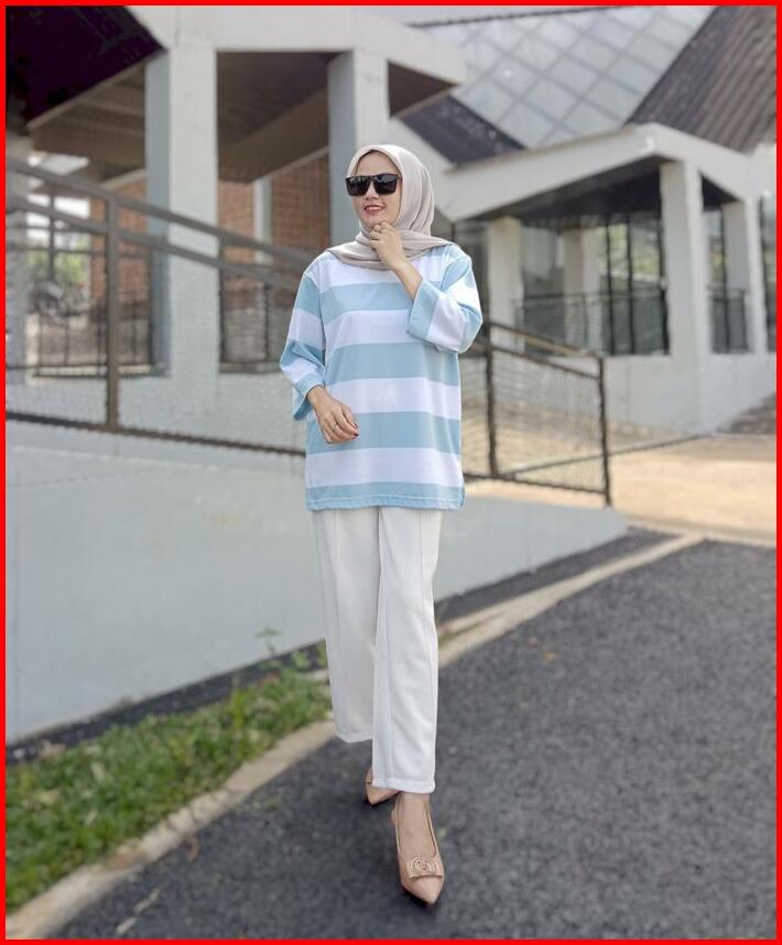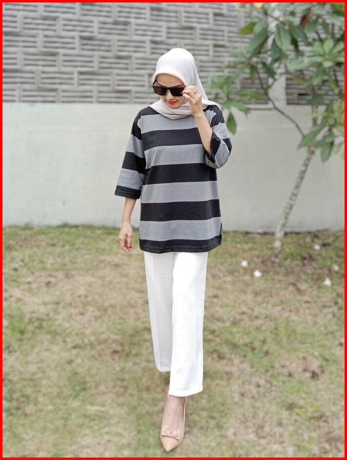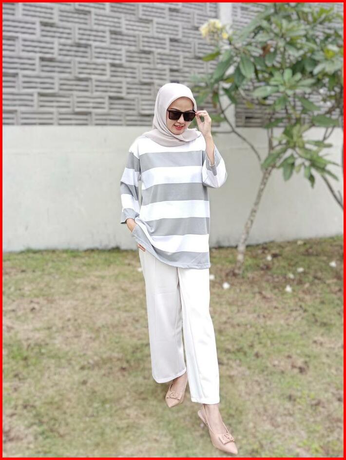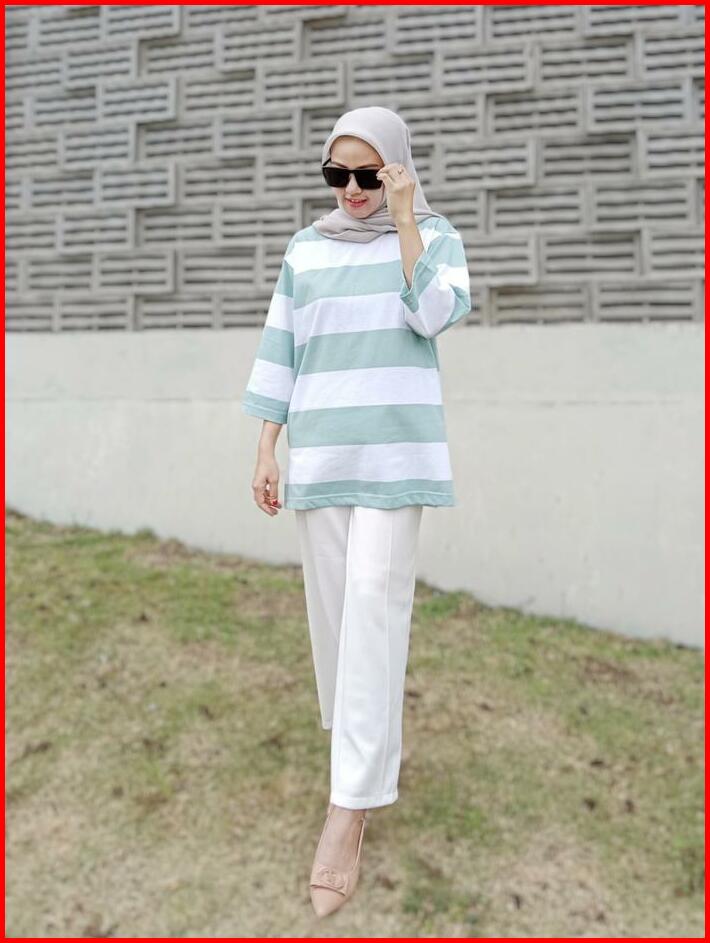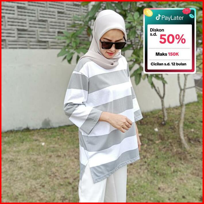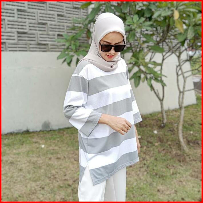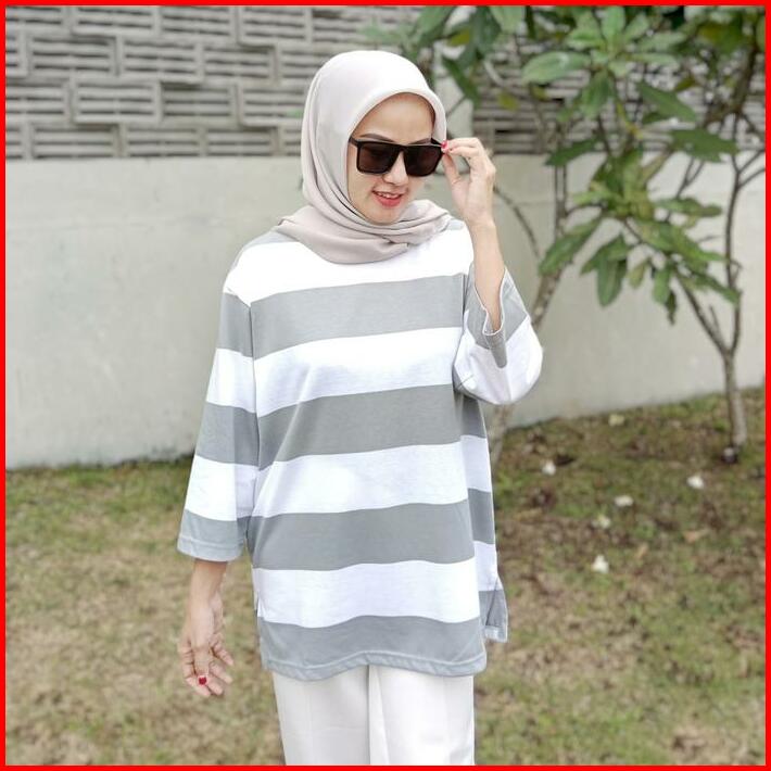 Terlaris Kaos Oversized Wanita Oversize Striped Basic T-shirt Atasan Setrip Blouse Jumbo Katun Abu