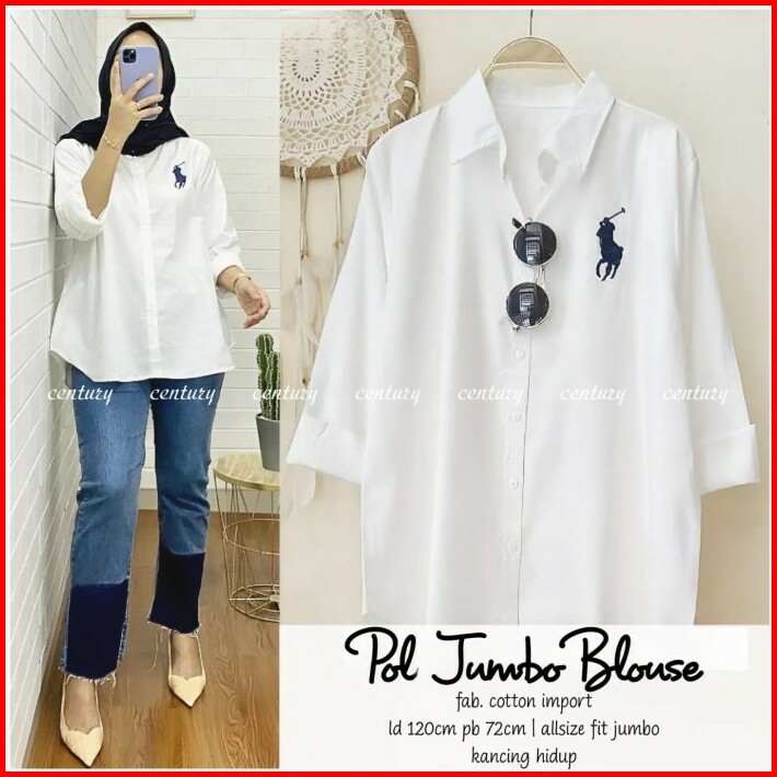 Polo Jumbo Blouse White Katun Import Fit To Xxxl Kancing Hidup Ld120