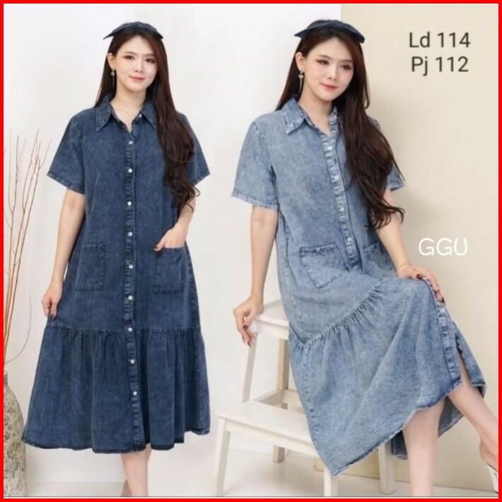 Ggu Dress Wanita Jeans Denim Jumbo Ld114 Pj112 Full Kancing Model Bawah Ruffle Midi Dress