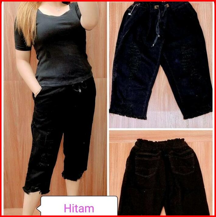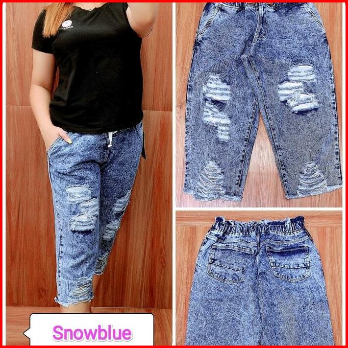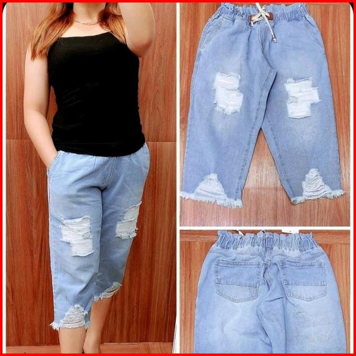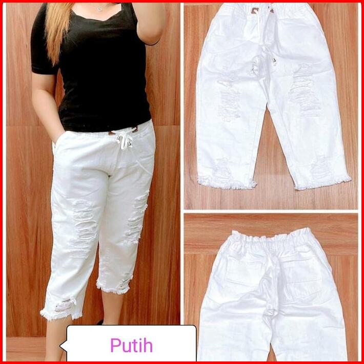 Celana Jeans Wanita 7per8 Sobek Rawis Pinggang Full Karet 27-38 Denim Rawis Cewek Karet Dewasa