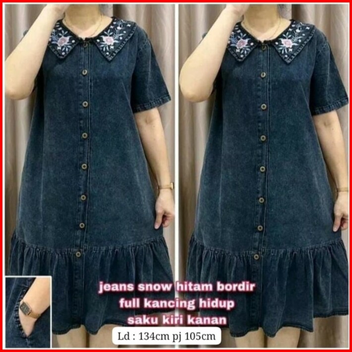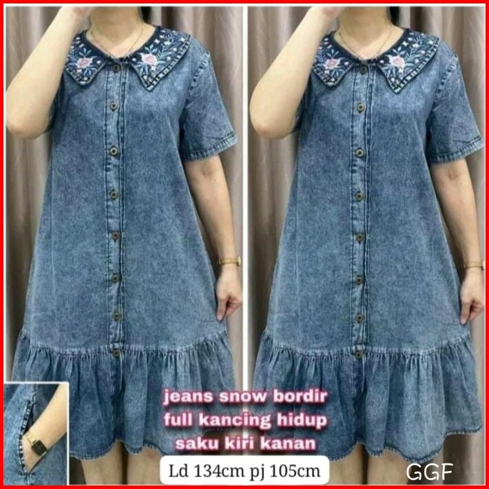 Ggf Dress Wanita Jeans Denim Jumbo Ld134 Pj105 Full Kancing Kerah Collar Bordir