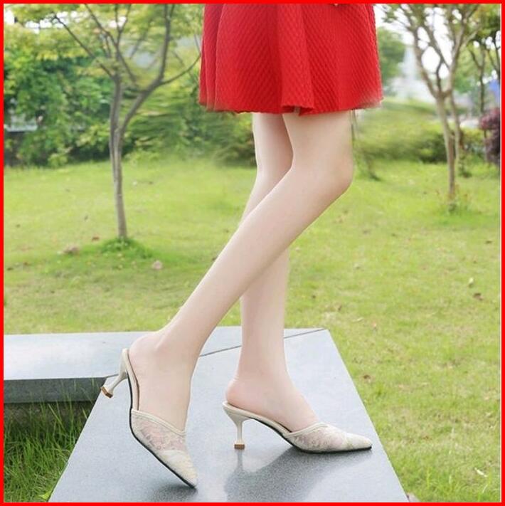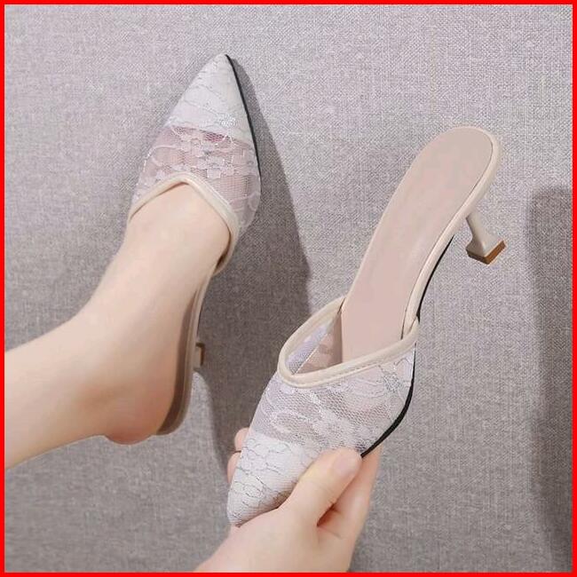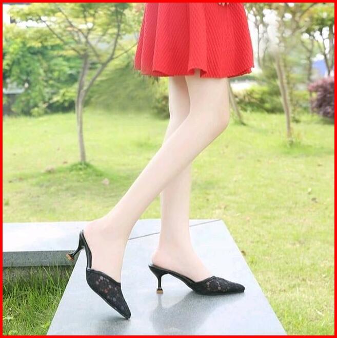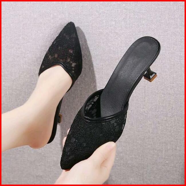 Pesta Heels Dcollection Dc 02 Brukat Elegan Sendal Wanita Hak Runcing Mules Hak Tinggi Square Toe Hitam Shoes Karet Kasu
