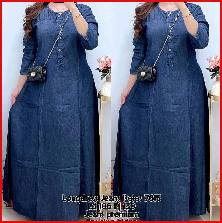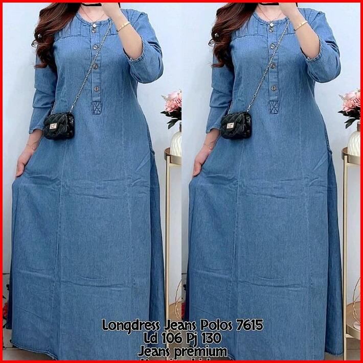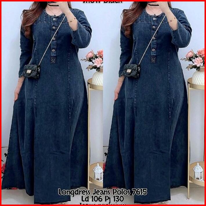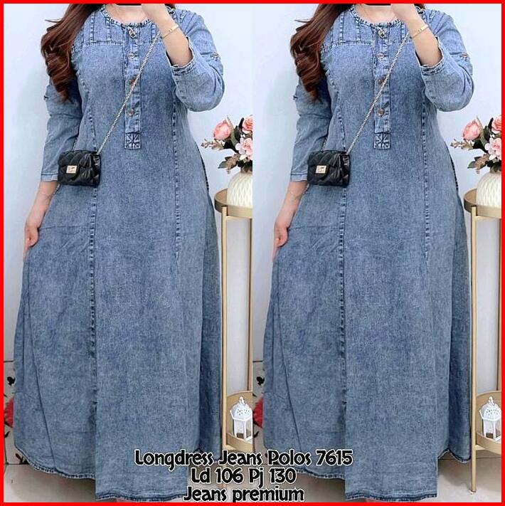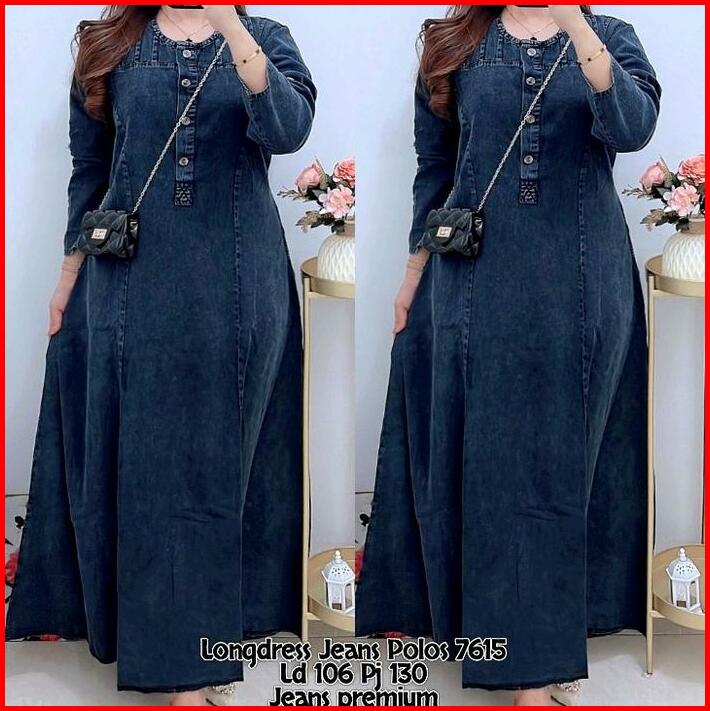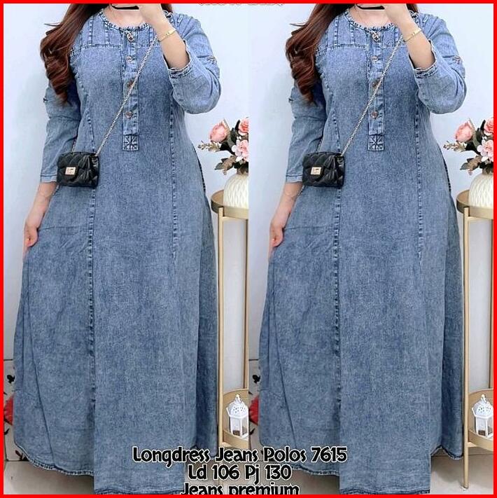 7615 Longdress Jeans Lengan Panjang Wanita Dress Jeans Maxi