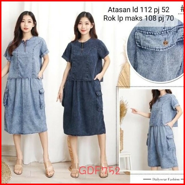 Gdf753 Setelan Wanita Jeans Denim Atasan Ld112 Polos Bawahan Rok Pinggang Full Karet Max108cm Saku Celana Pj70 Snow