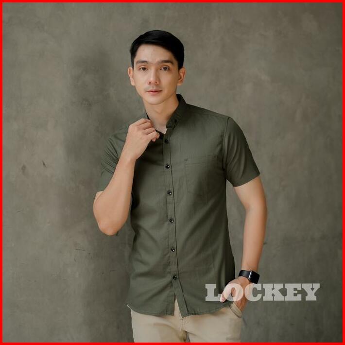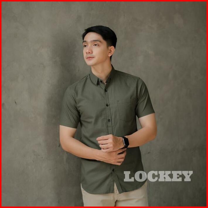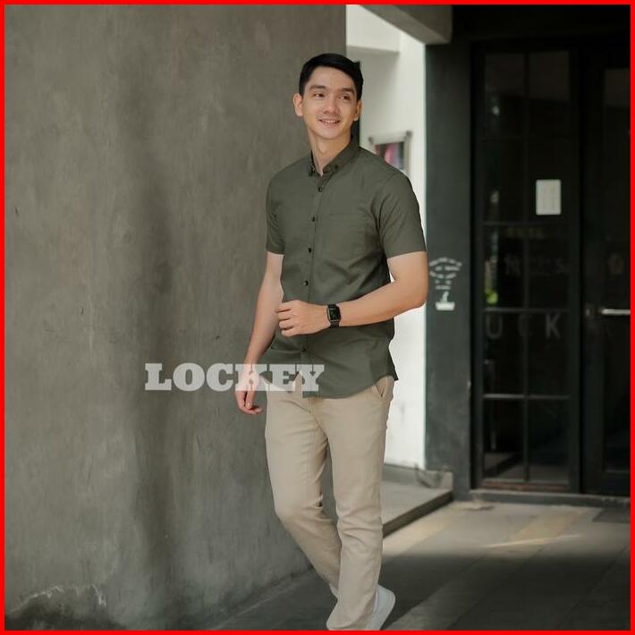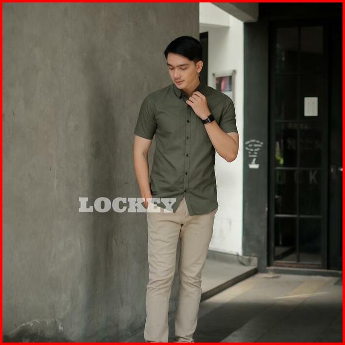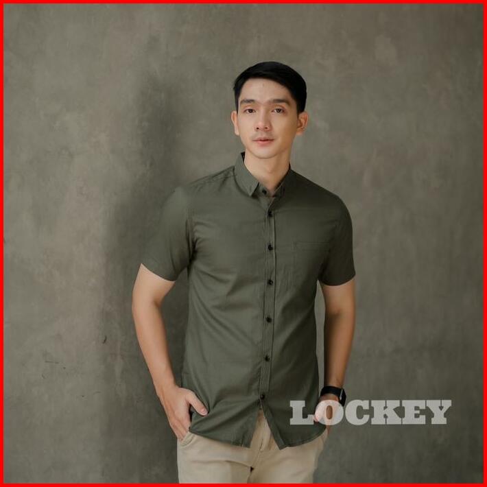 Kemeja Polos Pria Lengan Pendek Slimfit Warna Hijau Army