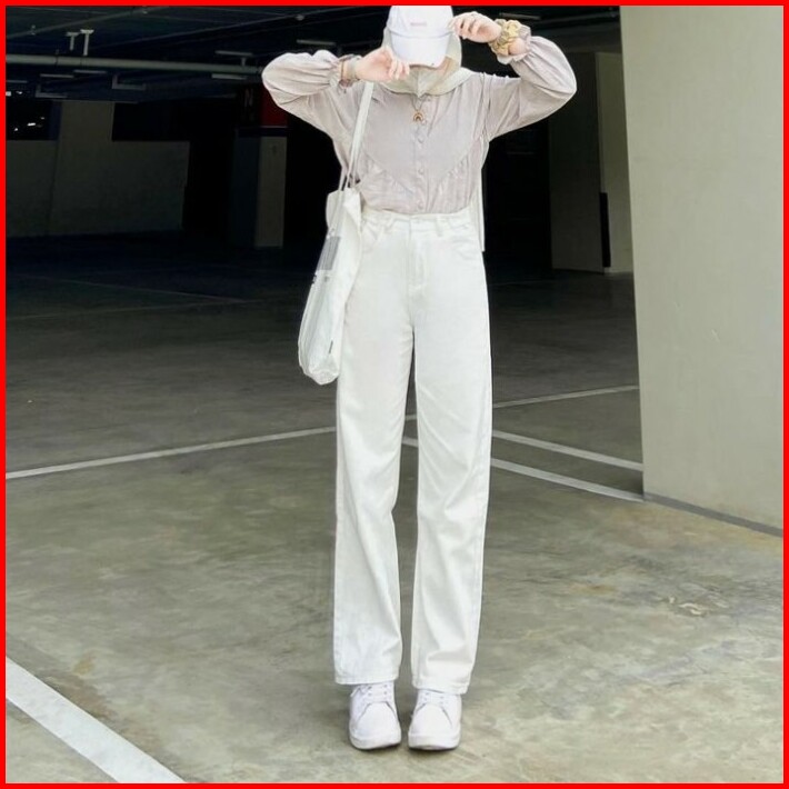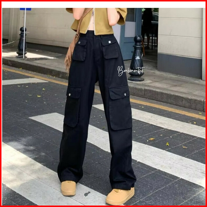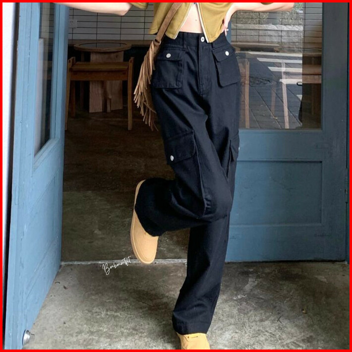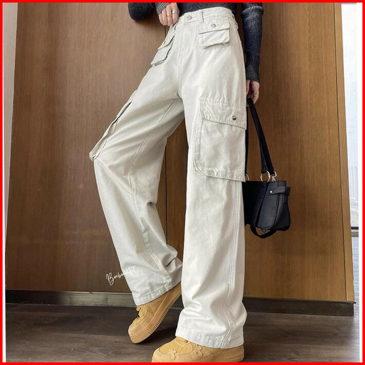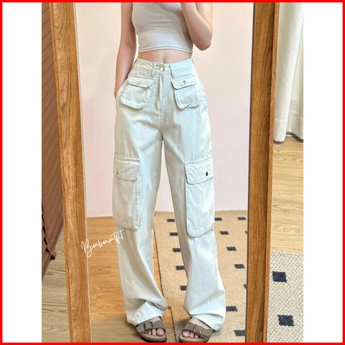 Cargo Denim Pasir Putih Wanita Highwaist Loose Celana Cargo Jeans Wanita Korea