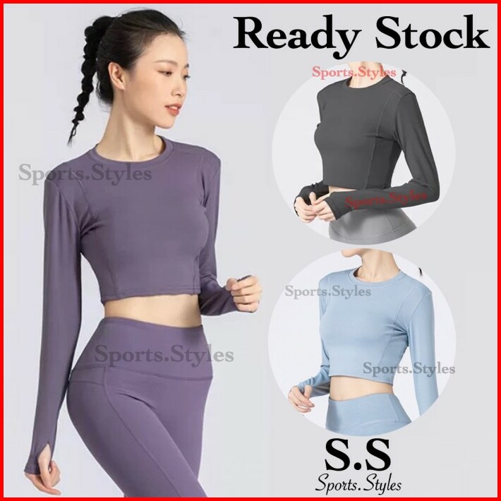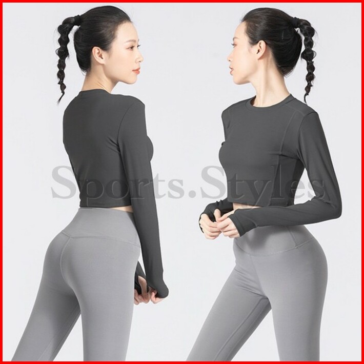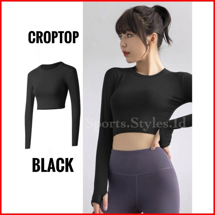 Baju Lengan Panjang Crop Top Wanita Kaos Senam Olahraga Fitnes Lari