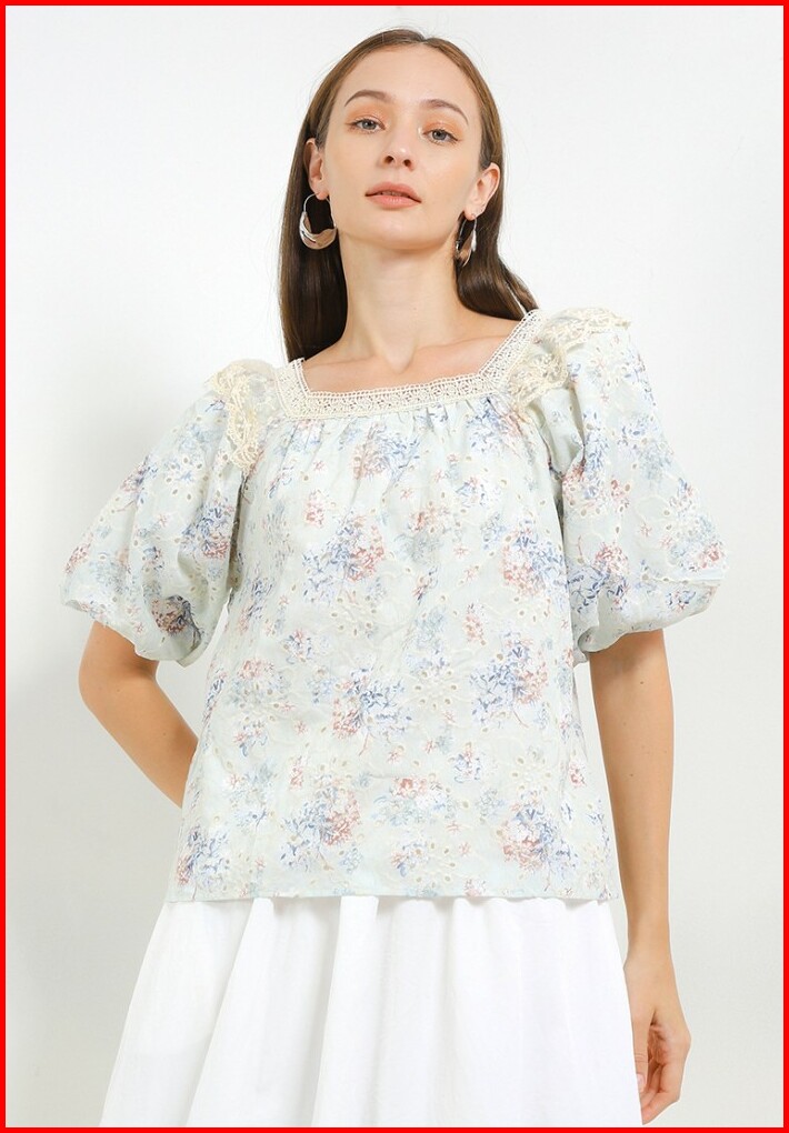 Chic Simple Puff S S Square Neckline Eyelet Flo Print Blouse Bl7830