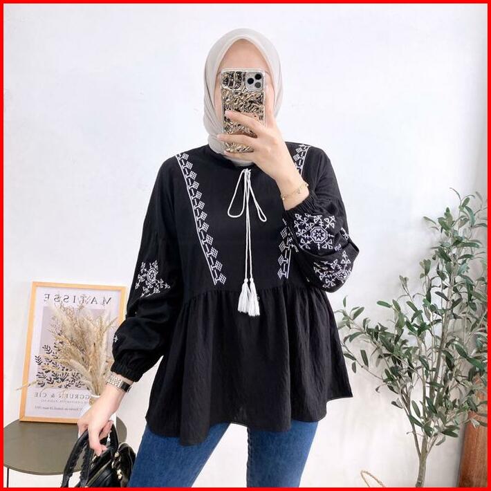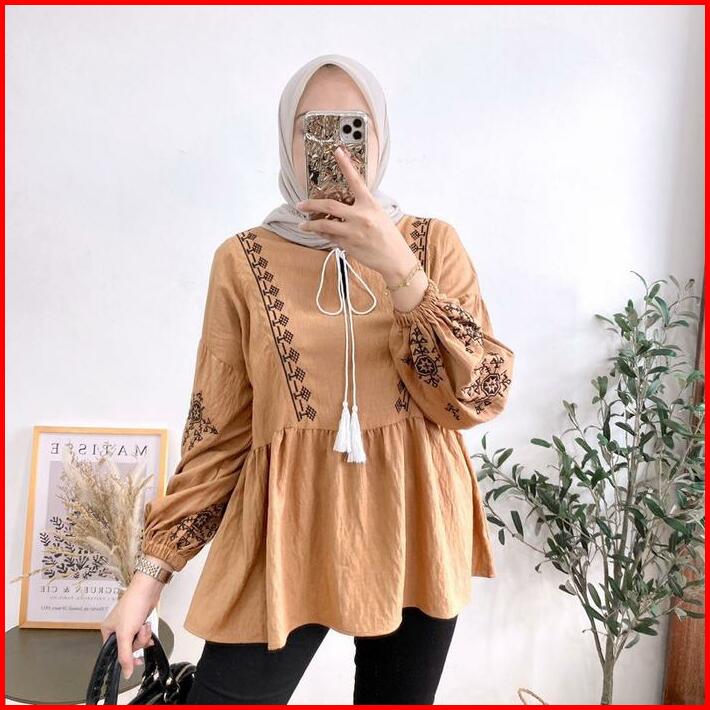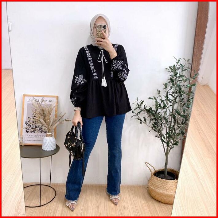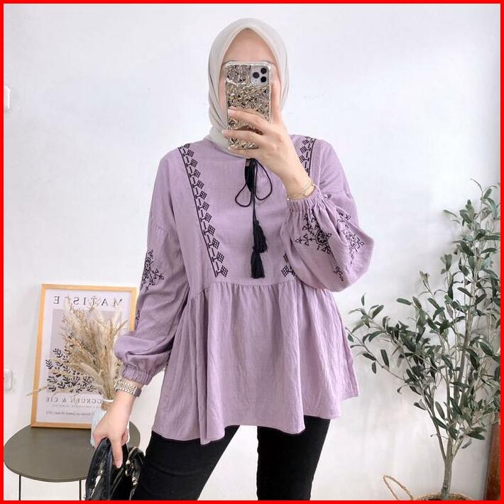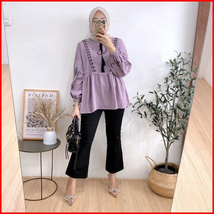 Helena Shirt Blouse Kemeja Atasan Wanita Bahan Crinkle Airflow Premium Emboidery Asli
