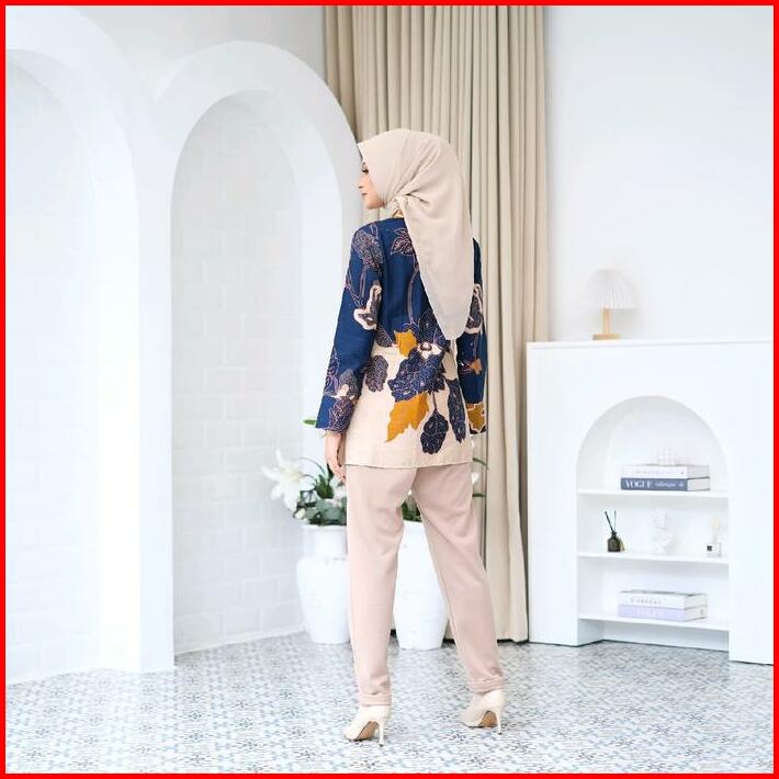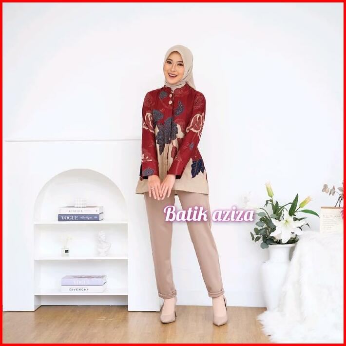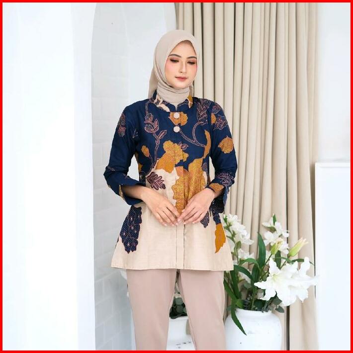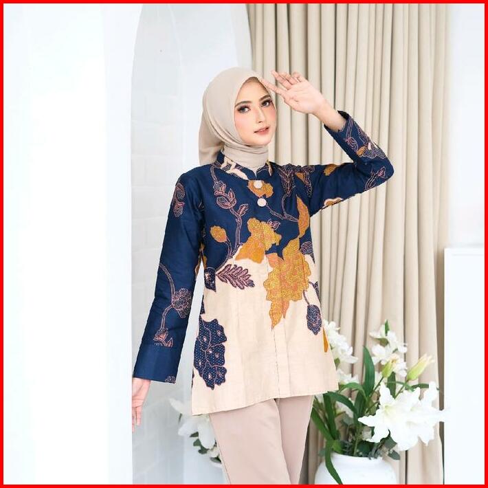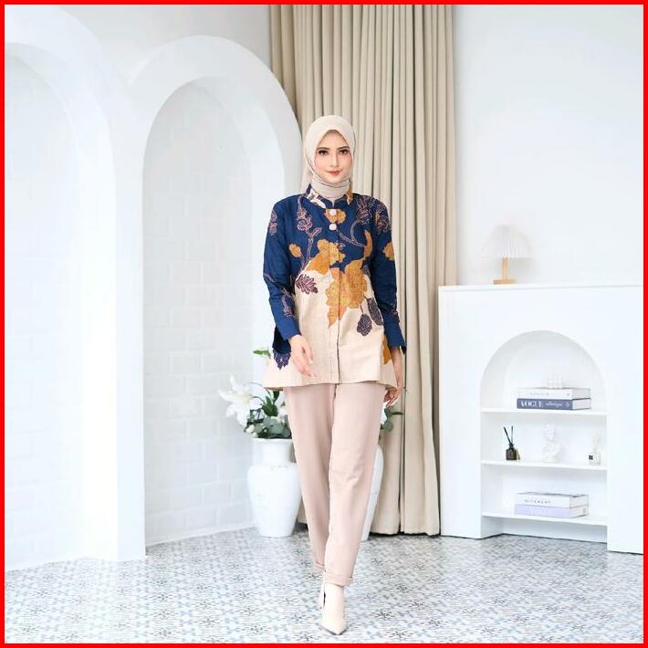 Batik Katun Kerja Wanita Baju Batik Wanita Batik Modern Wanita Kancing Depan Blouse 2in1 Motif Mawar Lenganpanjang Atasa