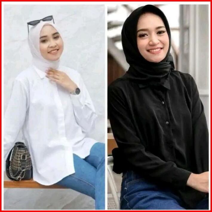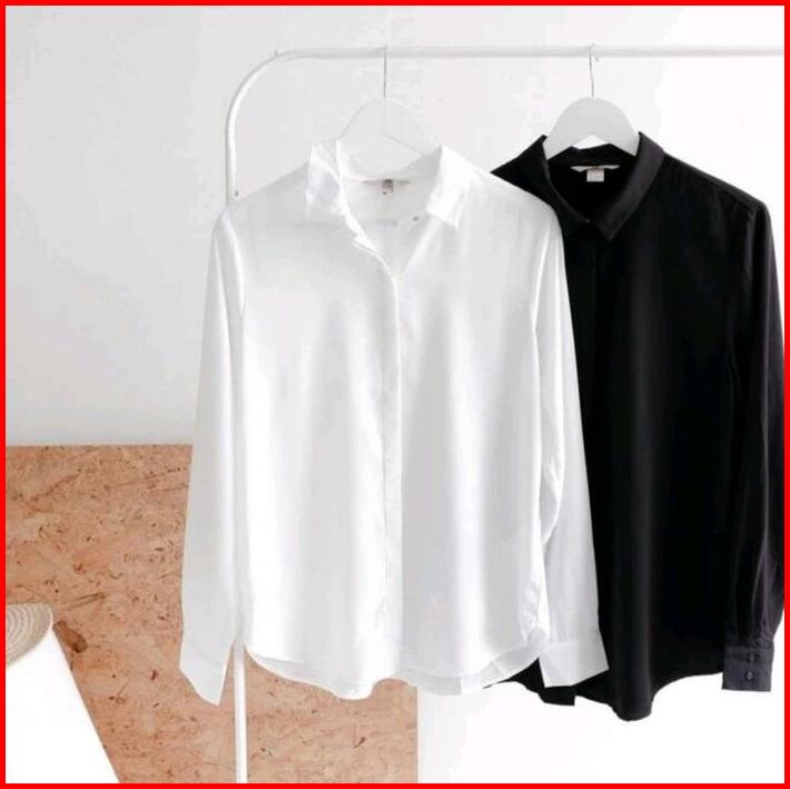 Kemeja Wanita Polos Lengan Panjang Casual Baju Kantor Hitam Putih