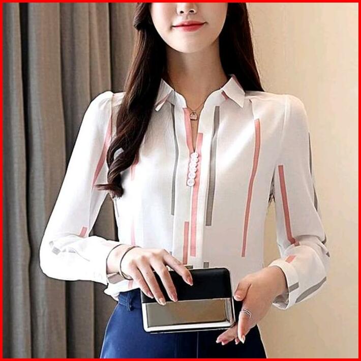 M Sampai 4xl Blus Kemeja V-neck Wanita Motif Stripe Kancing Mati Kemeja Formal Dan Non Formal Wanita Terbaru Atasan Panj