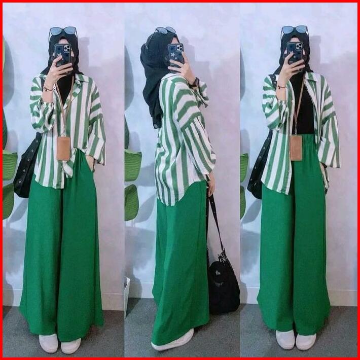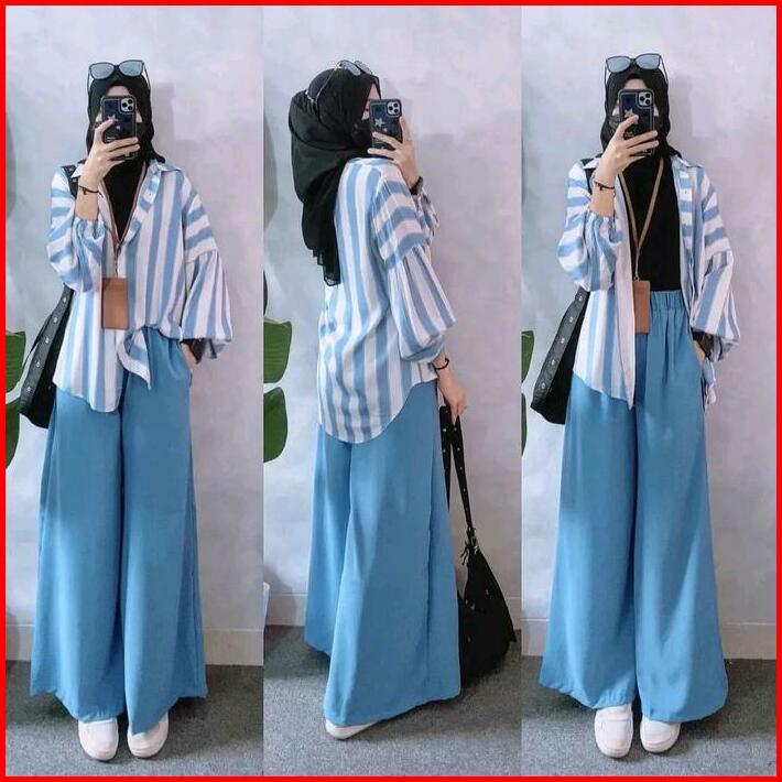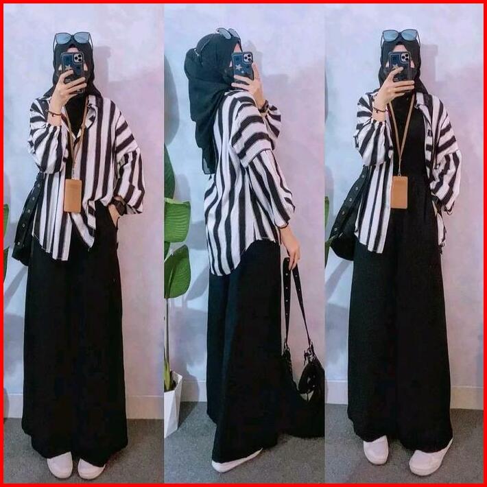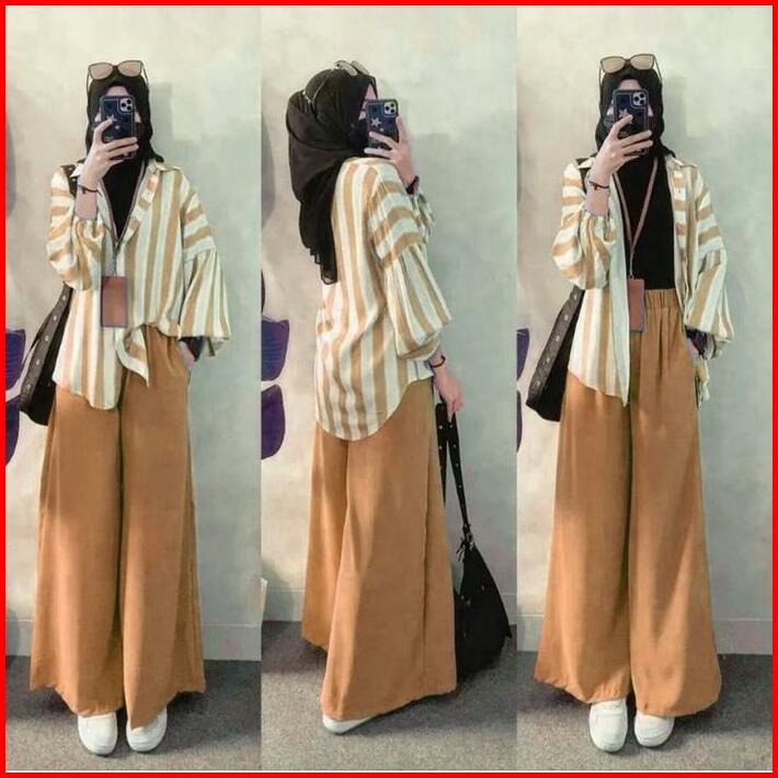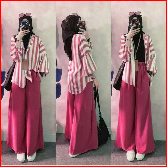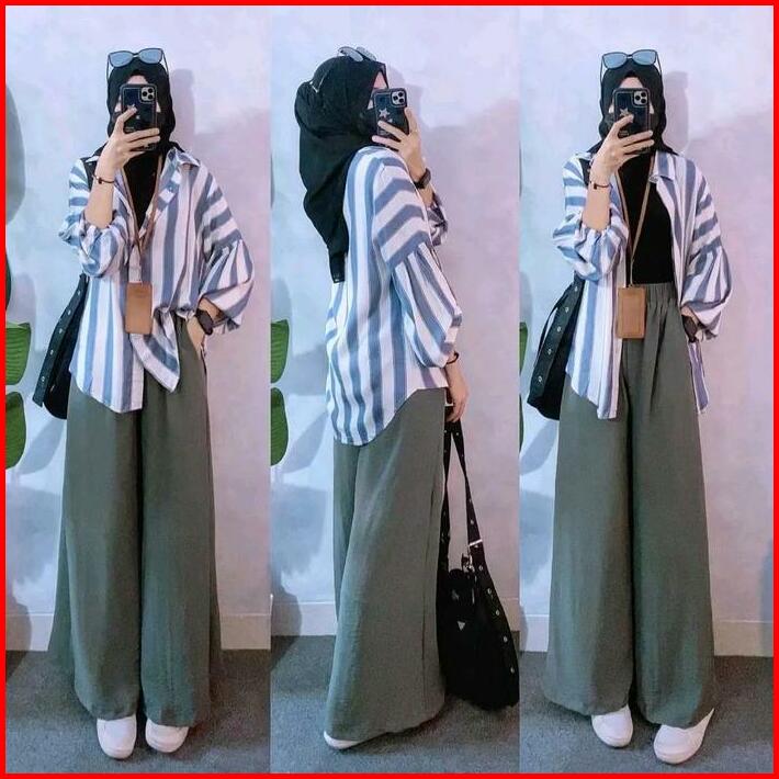 Namira Strip One Set Kulot Setelan Tunik Baju Atasan Muslim Oversize Crinkle Airflow Motif Celana Panjang Karet Melar De