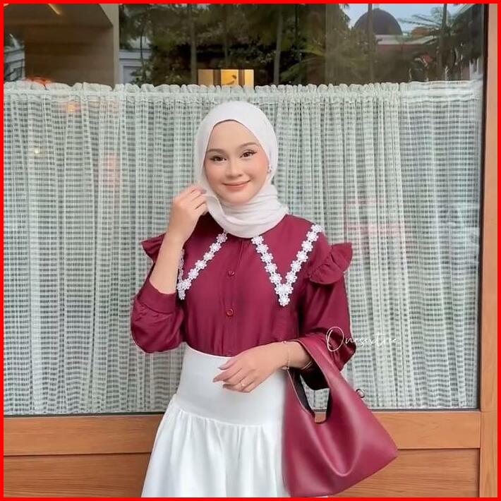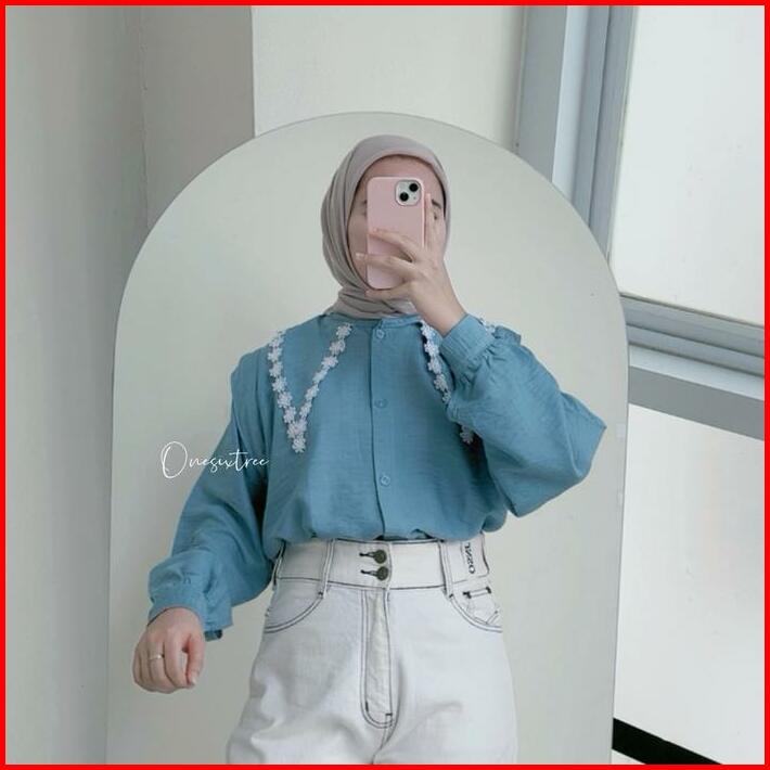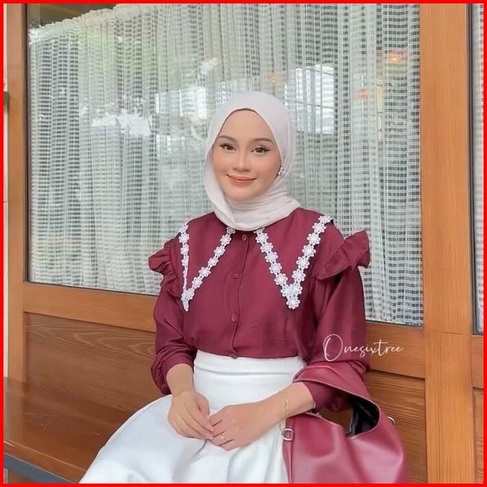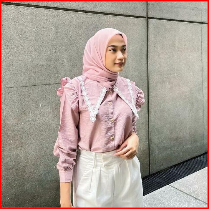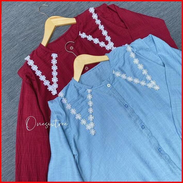 Leoni Blouse Kerah Sailor Renda Baju Atasan Panjang Wanita Katun Polo Linen