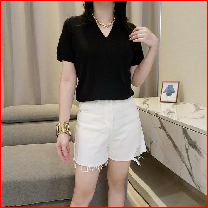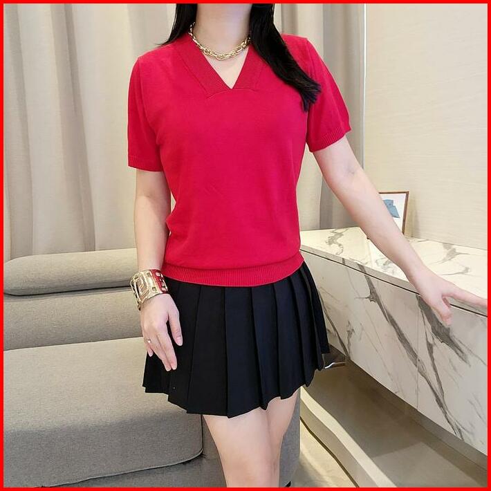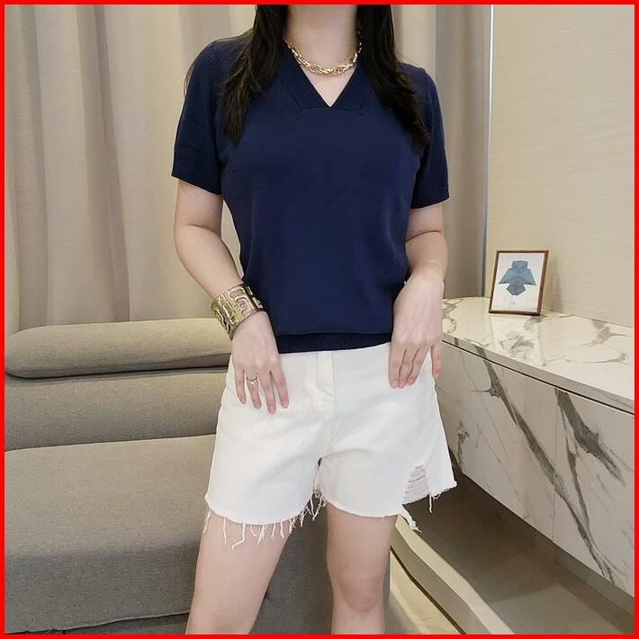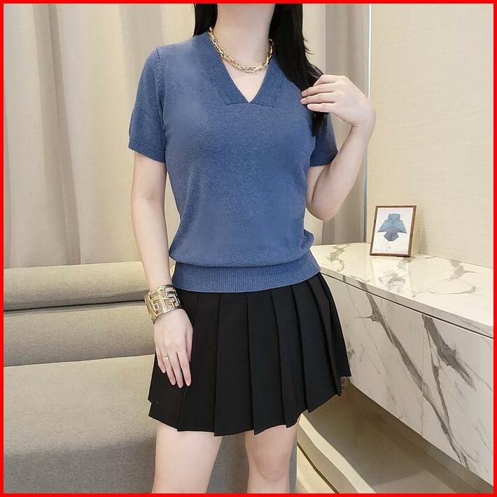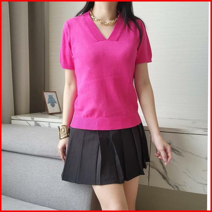 Miki Vivi Basic V Shortsleeve Knit Top Atasan Blouse Rajut Wanita Korean Style Kekinian Motif Polos Lengan Pendek Kerah