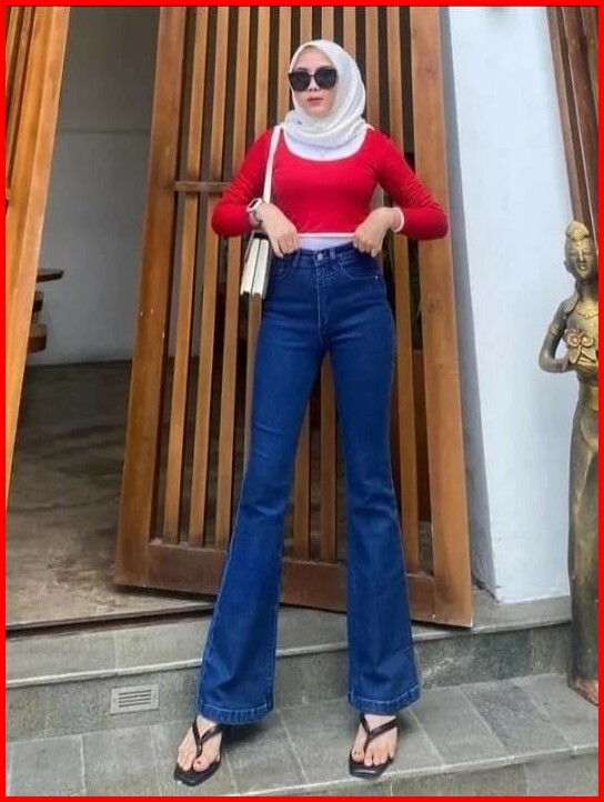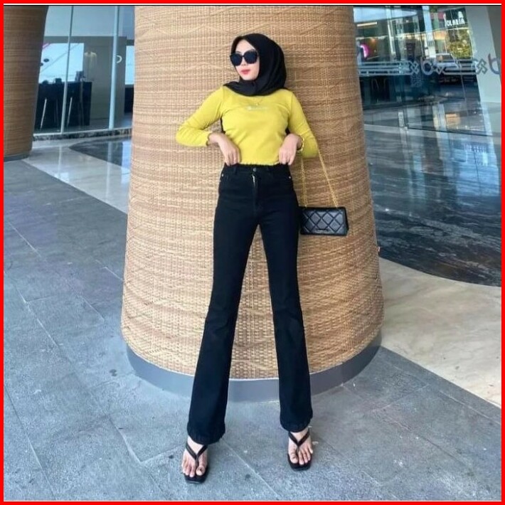 Celana Highwaist Kaki Lebar Cutbray Wanita Jeans Bahan Melar