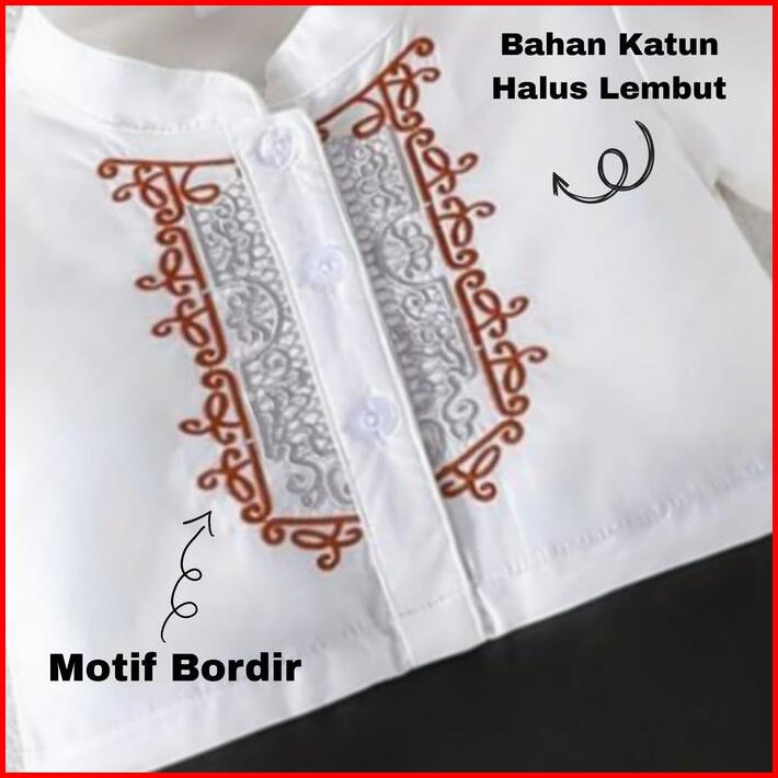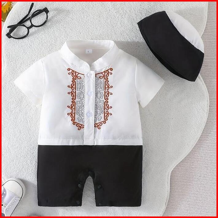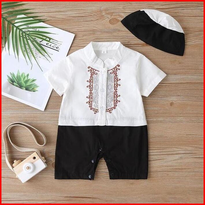 Baju Koko Anak Bayi Muslim Laki-laki Usia 0-12 Bulan Model Romper Bahan Kain Katun Lembut Motif Bordir Plus Topi Peci Mo