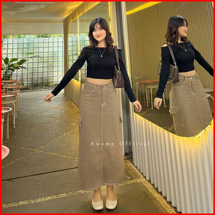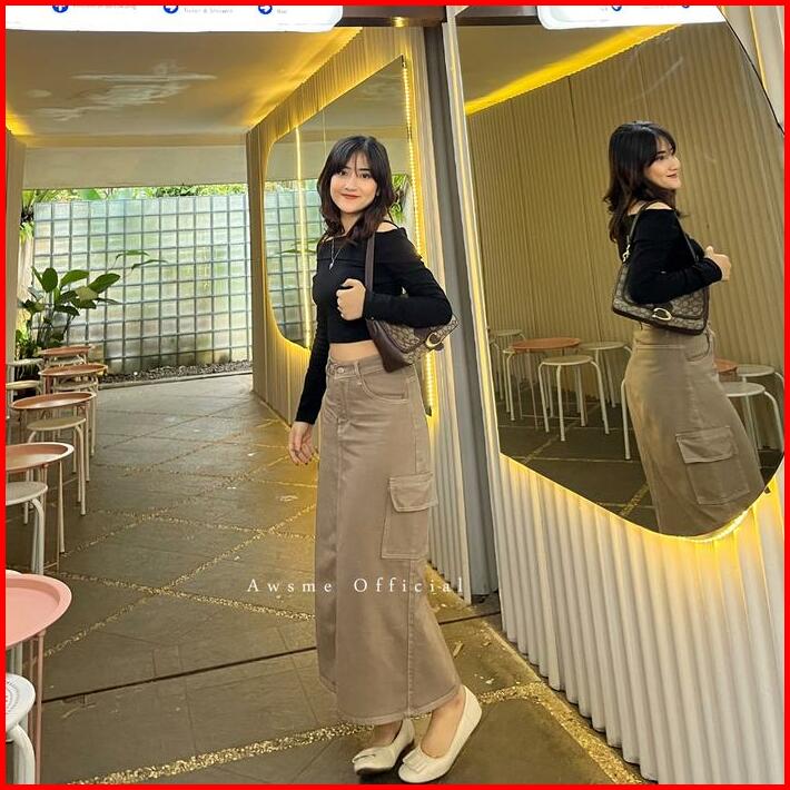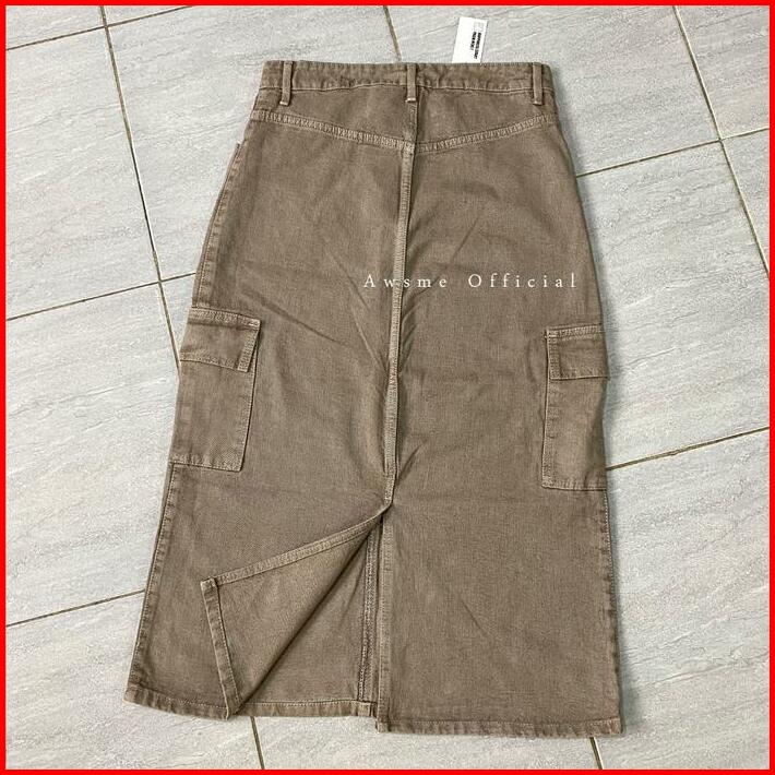 Rok Cargo Jeans Mocca Celana Wanita Denim Highwaist Midi Skirt