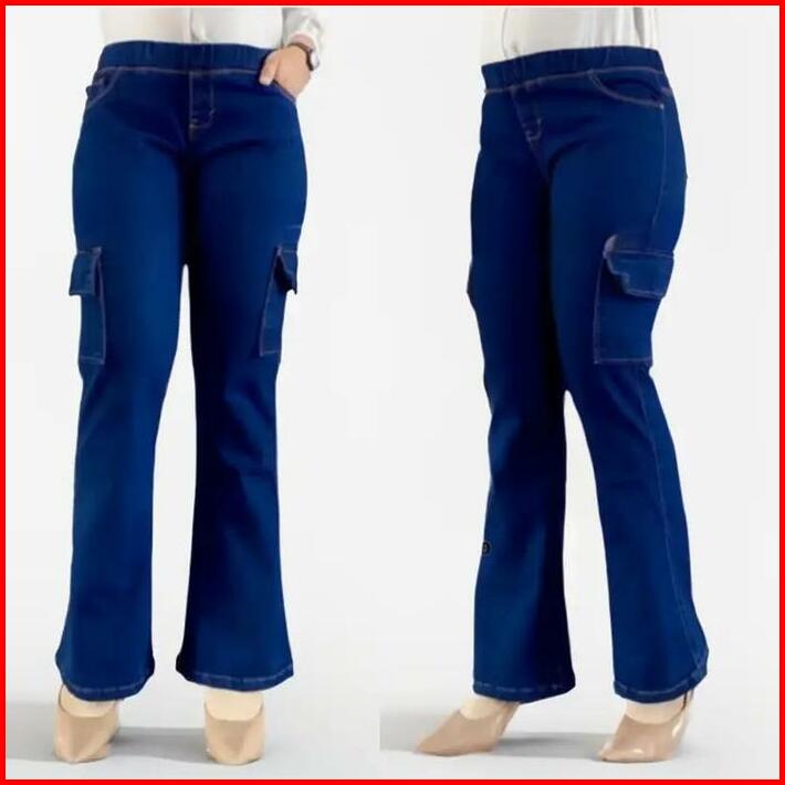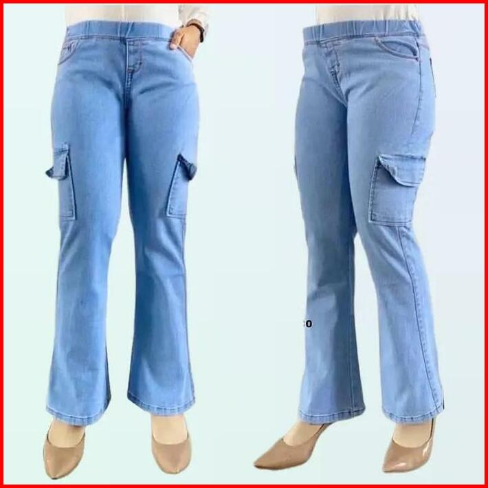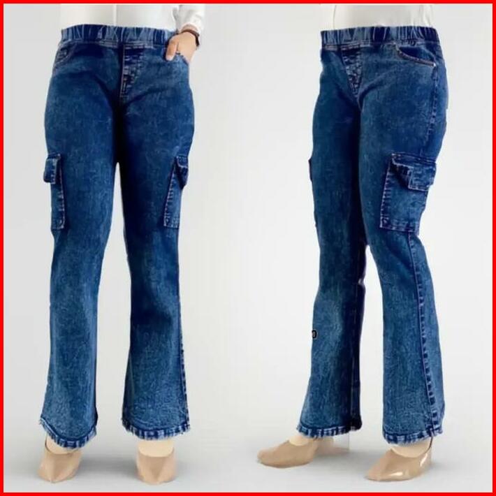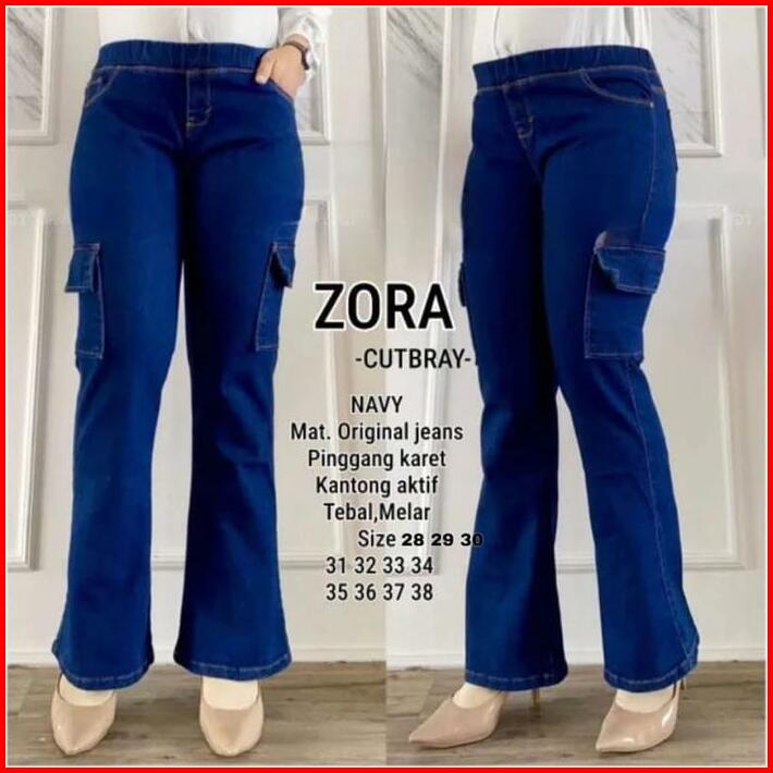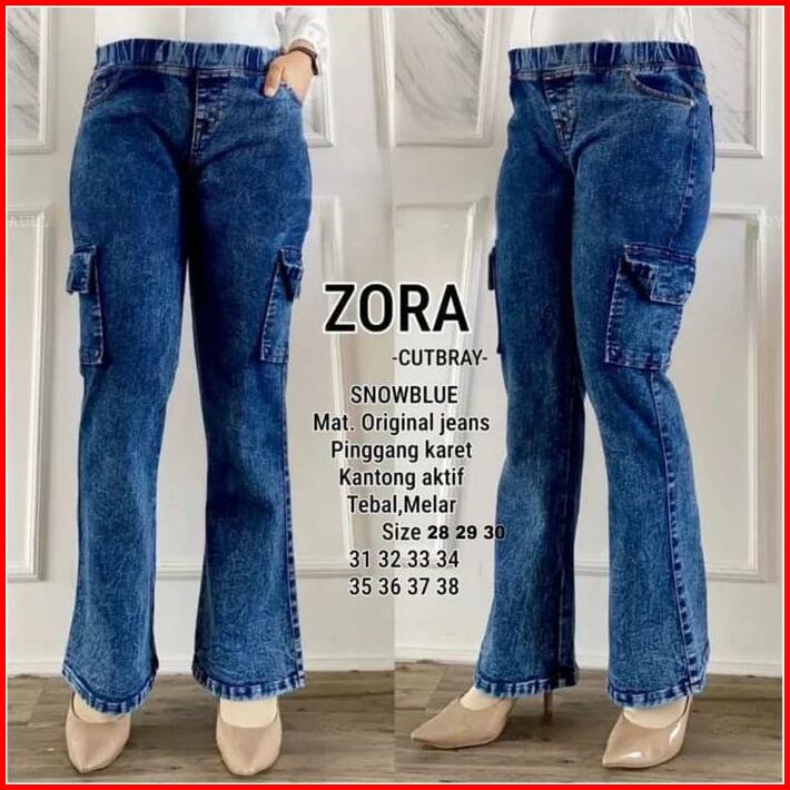 Zora Celana Jeans Cutbray Wanita Pinggan Karet Rekomendasi Influencer Viral Cargo Kantong Melar Light Panjang Casual Den