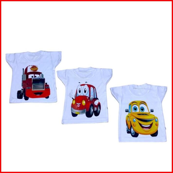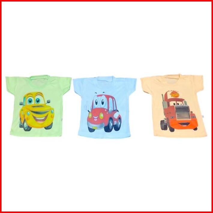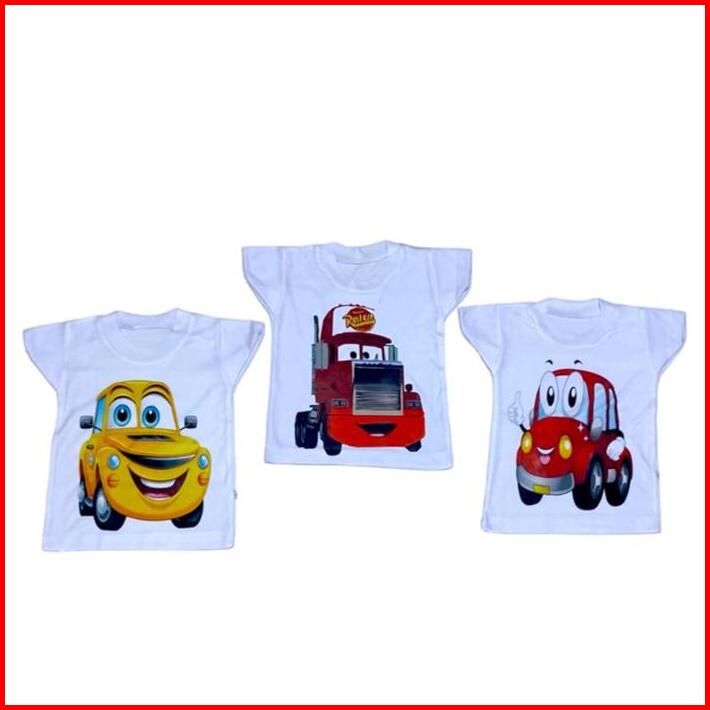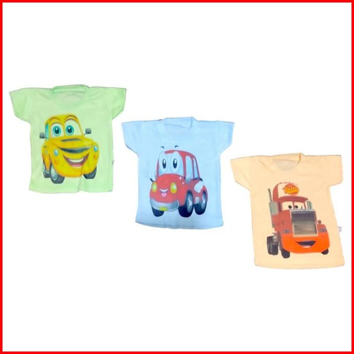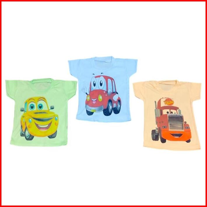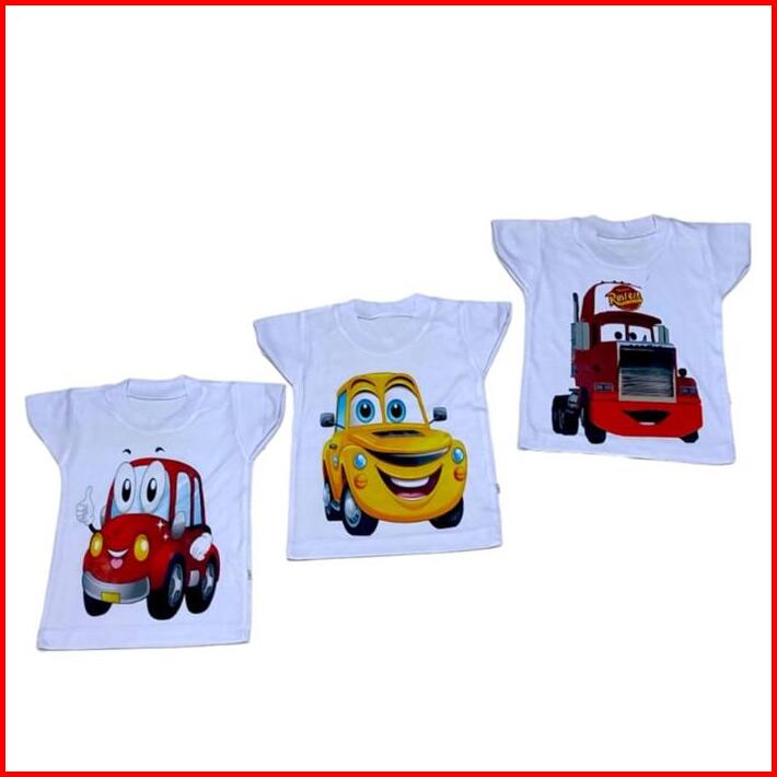 3 Pcs Baju Kaos Oblong Bayi Anak Cotton Serian Putih Warna Mobil Print Sublimasi Merk E77 Sni Tebal Lembut Halus Berkual