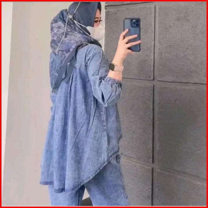 Setelan Jeans Wanita Setcel Pinguin Jeans Premium Nyaman Celana Atasan Denim