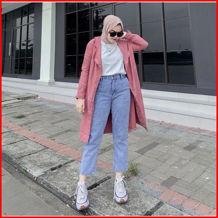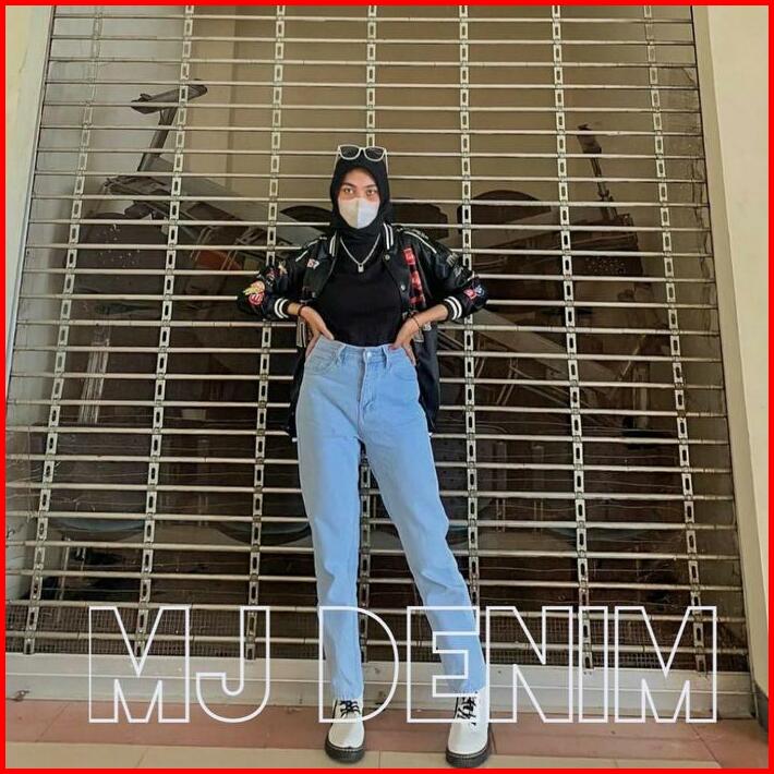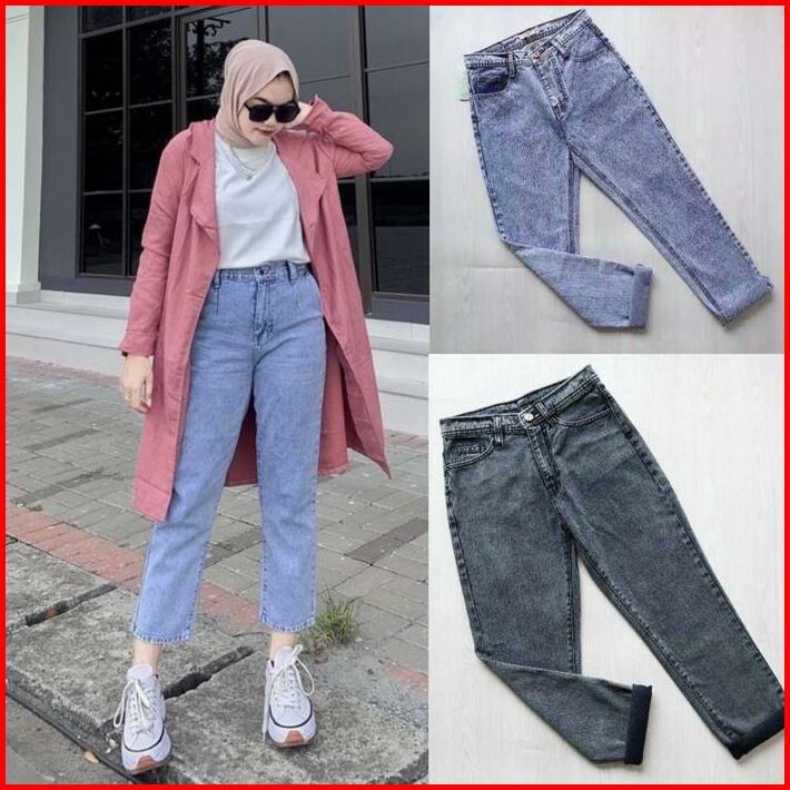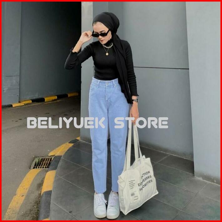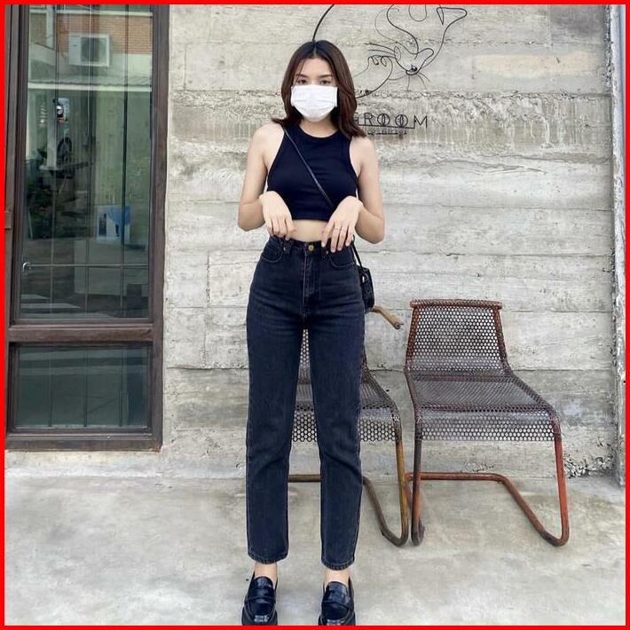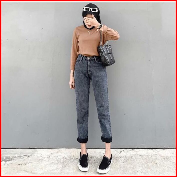 Celana Jeans Boyfriend Wanita Highwaist Santai Slim-fitting Polos Panjang Hitam Cewek Denim Dewasa