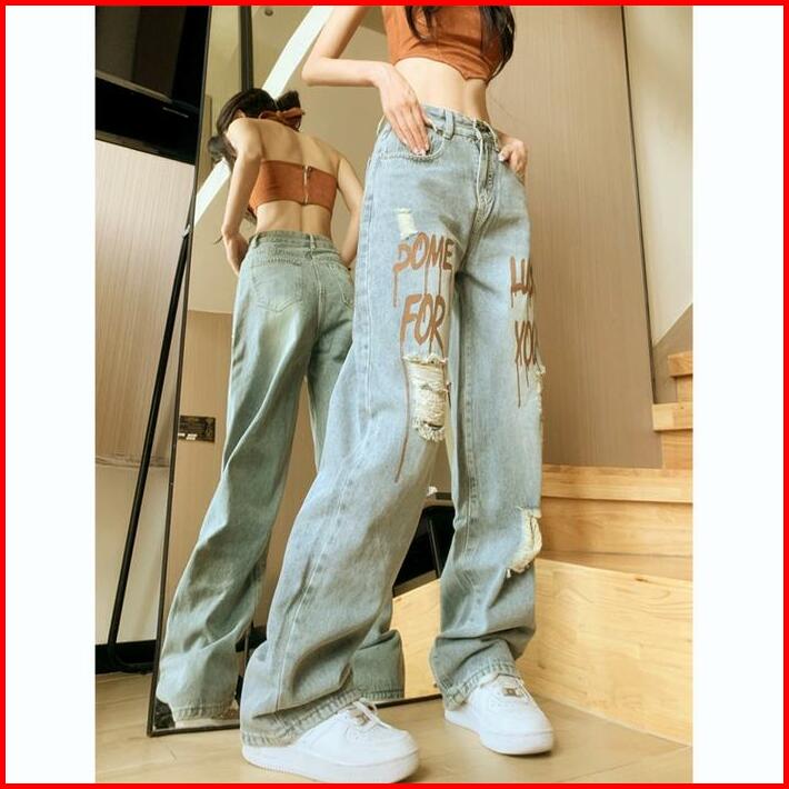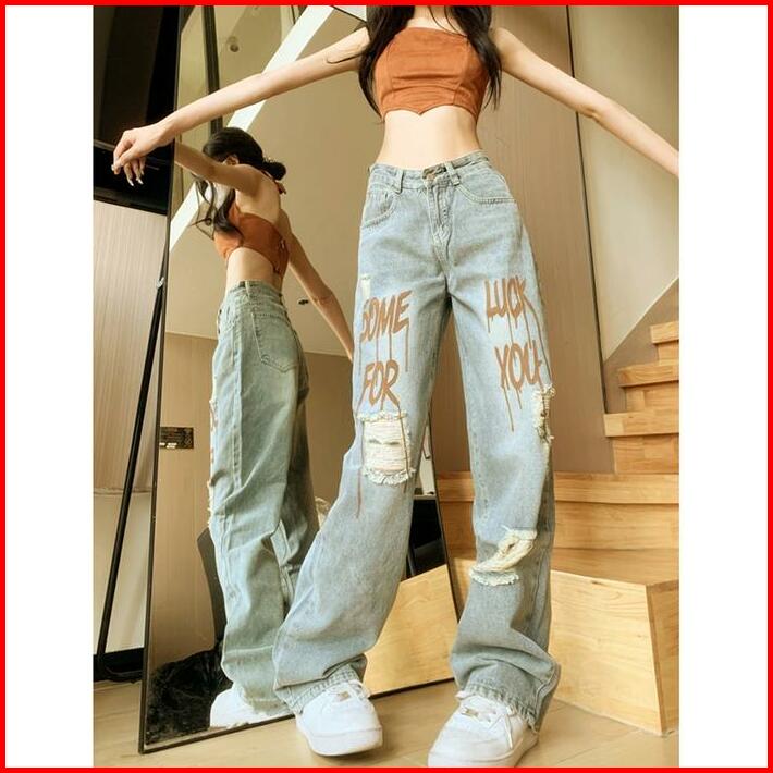 Jeans Pinggang Tinggi Spice Girls Celana Robek Motif Huruf Vintage Celana Denim Kasual Longgar Biru Kaki Muda Panjang St