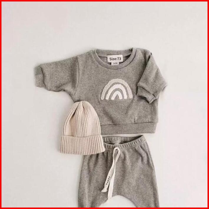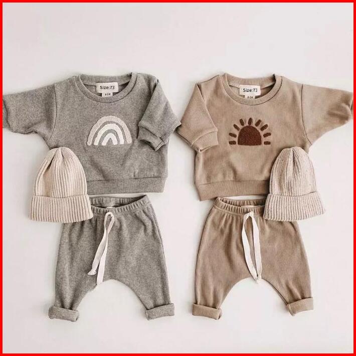 Setelan Sweater Anak Laki-laki Aesthetik Baju Bayi Balita Earth Tone Abu Dan Milo Gambar Matahari Dan Pelangi Newborn Sa